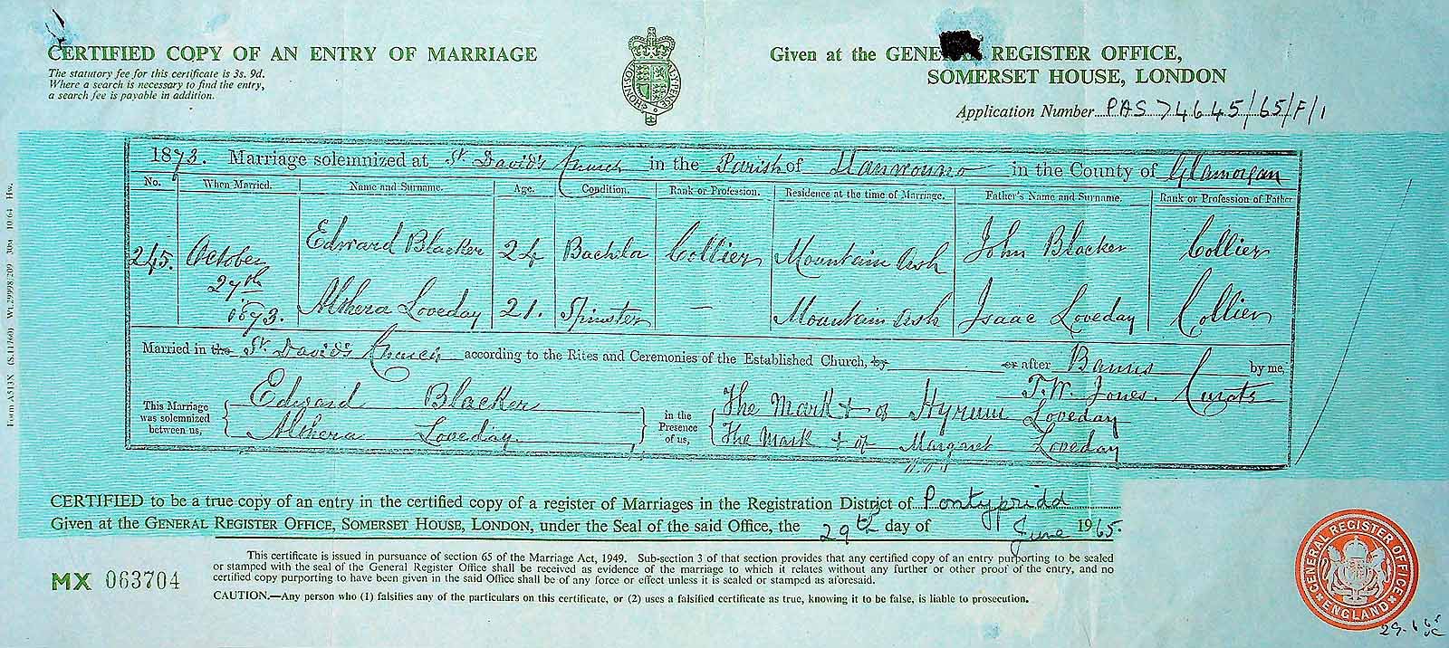 It should have been noted two paragraphs back that Edward's birth record according to family records was 15 June 1850. However, on the 18th of July of 1944, a certified copy of his birth certificate was made at the General Register Office, Somerset House, London. It shows his birth date as having been 10 September 1851 in Cwmtillery, which date was certified by the informant from the (X) The mark of John Blacker, Father, Cwmtillery on the 20th day of October 1851. Family records often see the need for further documentation and while birth, marriage and death certificates are not fool-proof from possible error ,they are accepted usually as preferable to family records. In making up a permanent family record it seems quite logical to use, in such a case as this, the date given by the birth certificate, but to make a notation elsewhere, perhaps in 'Necessary Explanations' the family date for future consideration. A generation later, the Edward Blacker family had a similar situation which will be mentioned later, in which the place of birth was different than the family record showed, as well as the birth date. Such errors are not unusual.
