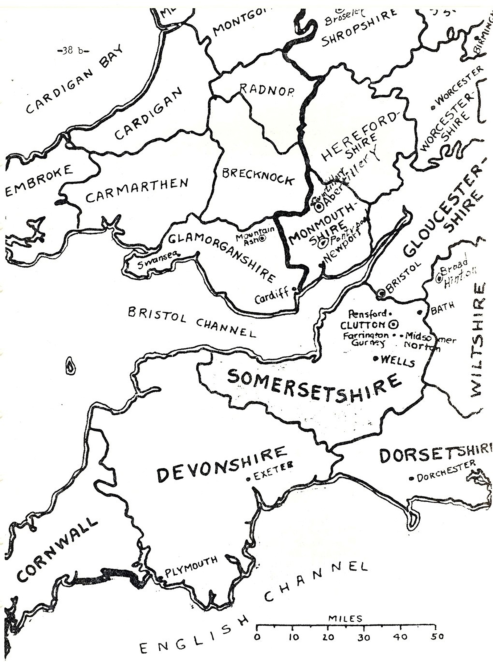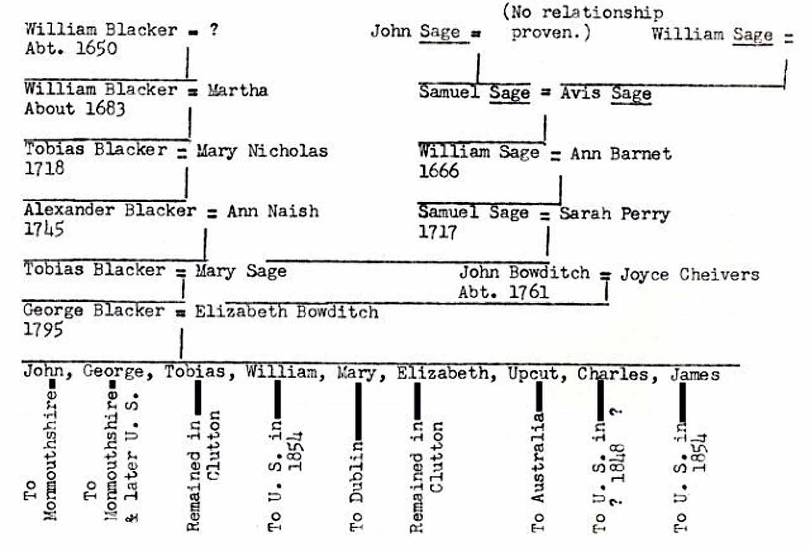 As we conclude this chapter we are also nearing the end of the Blacker story in England. George Blacker's and Elizabeth Bowditch's children were purposely included on the family chart shown above. Considerably earlier these same children were shown on a chart. The eldest son, John, became the subject of our family review when he and his wife, Maria Gould, took their little family from Clutton to Monmouthshire in about 1847. The story to this point has been confined to his family and his offspring's families.