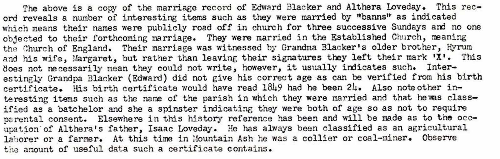 At the conclusion of the last chapter , we were yet considering the John Blacker family, which had moved to Monmouthshire before 1849, in which year their first 'Welsh' child was born. We followed them as best the information of them will permit, to the wedding of Edward and Althera Loveday. Prior to our story of the Loveday family we may find a family-tree chart helpful.
