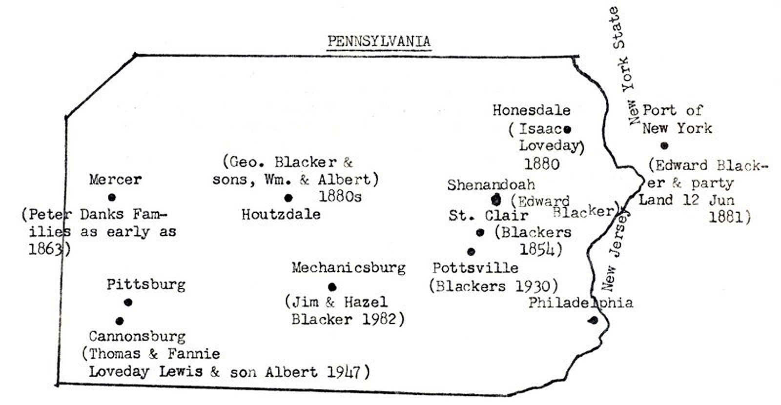 A very interesting item written in the family Bible which I saw while at Uncle William's home in Penrhiwceiber, was the following which I copied verbatim: "The first of June, Edward and John took water for America and landed on the 11th of June 1881". I was alone in the room when I copied it so didn't have an opportunity for Uncle William to answer some possible questions. It should have been of such import to me that I would have held my question for, perhaps, the dinner table or for some other time, but I failed to do so , much to my regret. A thousand and more times over I have wished I could have had the experience of that visit over again. As I look back now, I criticize myself for being so immature in my research efforts. I am - and have been - so very grateful for what I did glean. I am totally satisfied that the family data I gathered after these many years is correct, but considerable of it has had to be done by letter writing and other phases of research. As an example of the information I had copied was this item of 'Edward and John'. Frankly I did not realize at the time who John was. Family groups had not been organized on genealogical forms - by me, at least - and I was far from being acquainted with the family units of the overall Blacker family. With some I was slower getting acquainted with than others. All of this has led to probably unnecessary regrets, for Uncle William would have been happy to have assisted me getting these items sorted out. I had to do it the harder way. Perhaps I was helped as much or more in getting some families on my direct line sorted out by Fannie A. Blacker and Florence Blacker Fielding, both of Pennsylvania, by letters in the 1930s as by anyone else.