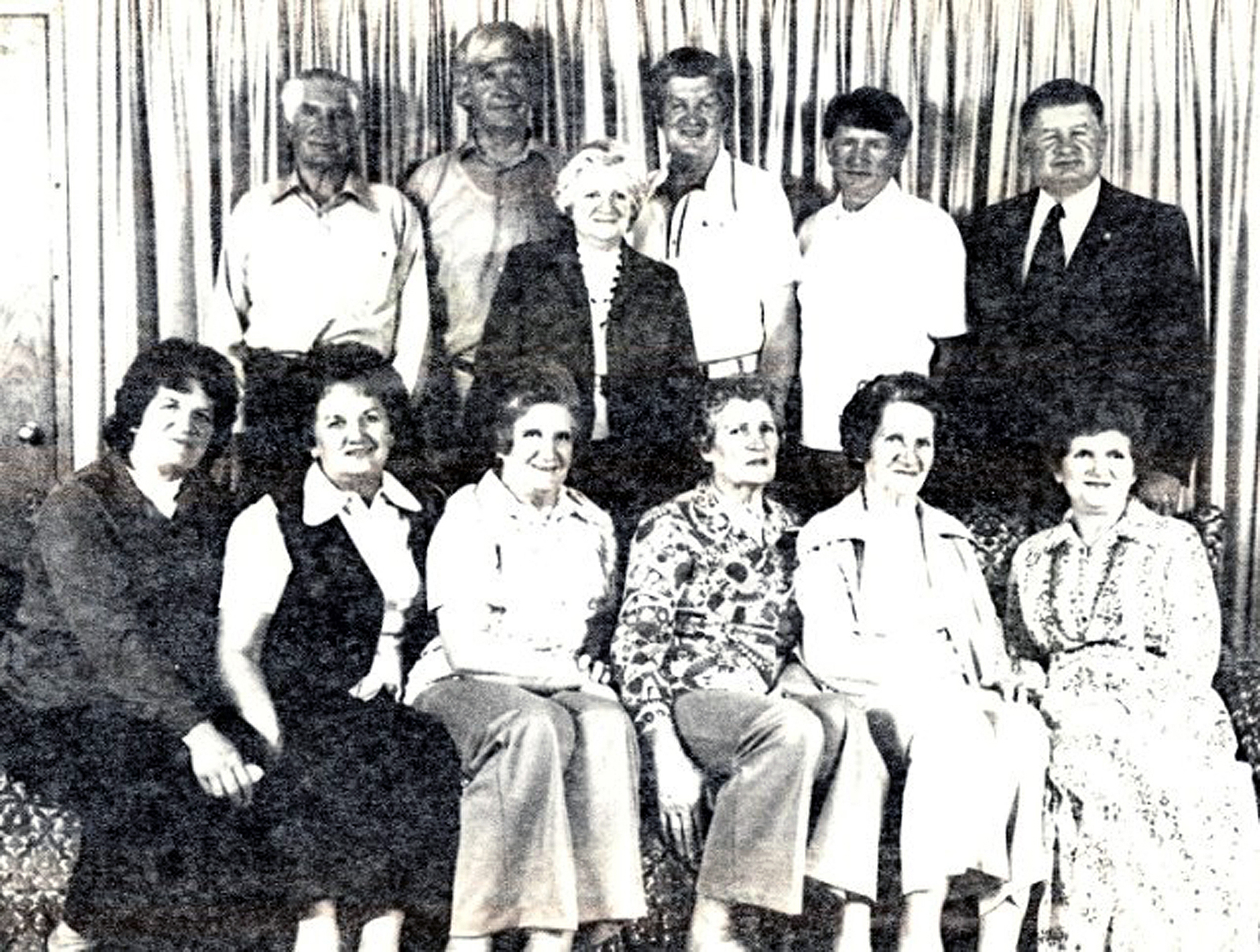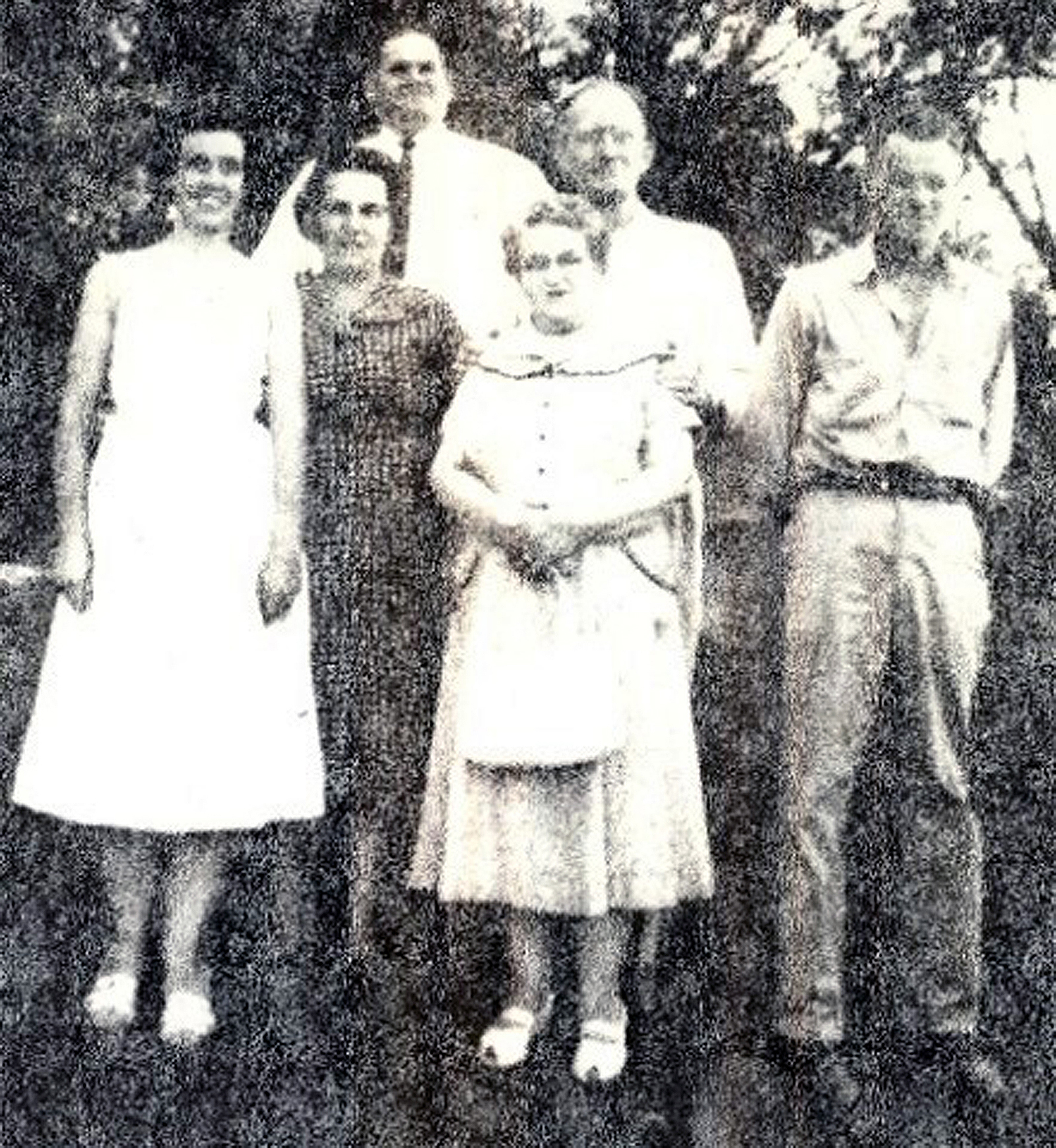 The Nisbet family in 1948. L to R: William, Uncle Arch, John and Downs. Back row: Annice, Elva and Irene.