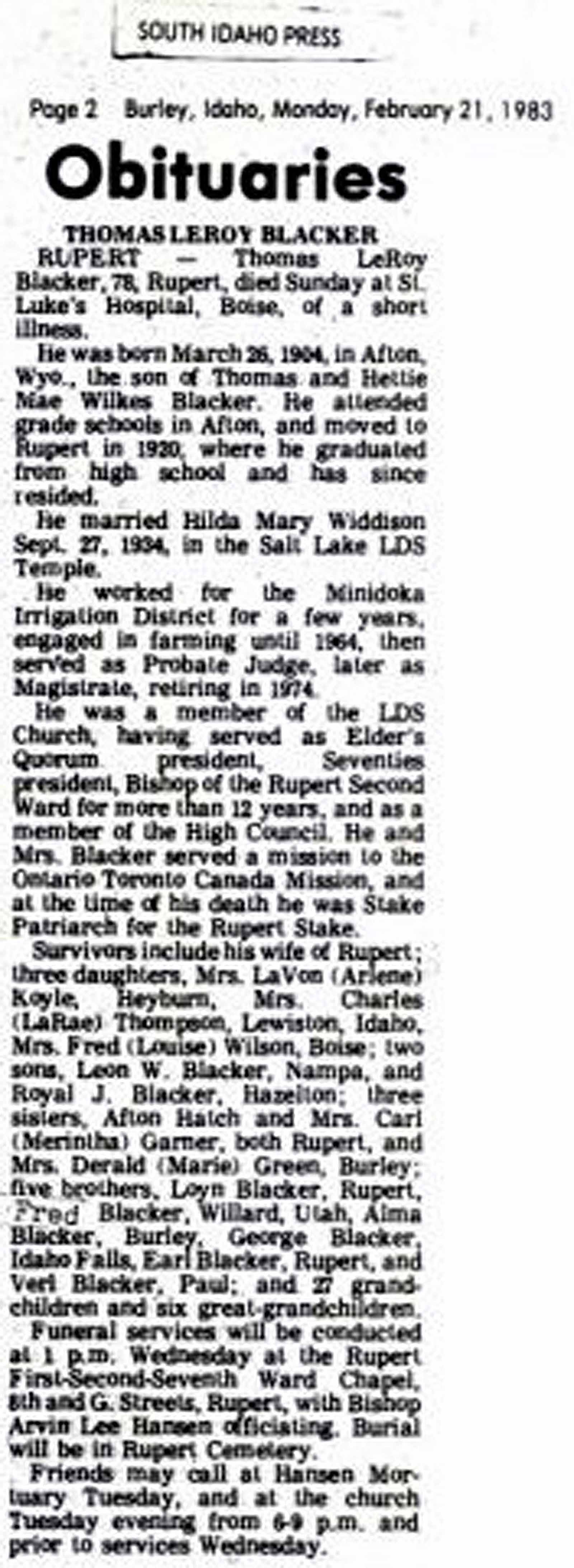 Survivors include a son, Dr. Kay Blacker, Mill Valley, Calif.; a daughter, Mrs. Ronald (Ann Marie) Astle, East Millcreek; seven grandchildren and a stepmother, Mrs. Edith Hill Cook, Salt Lake City.