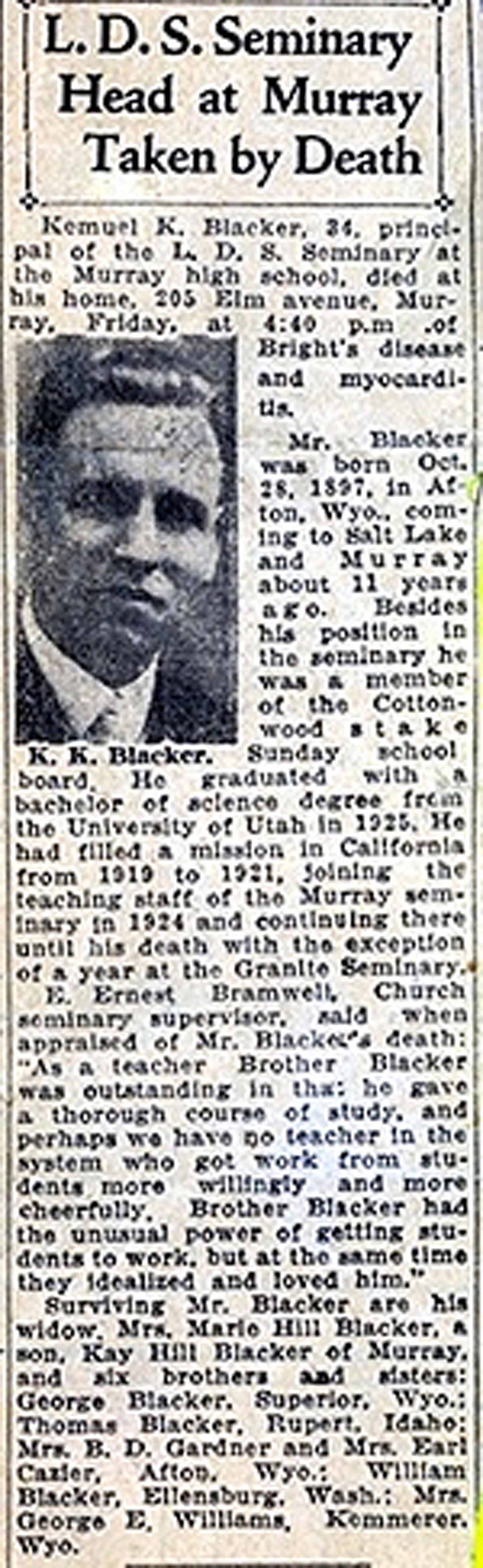 They were at this same apartment on the 20th of January 1928, on my entry in the Mission Home on Monday, January 23rd for my mission to Great Britain. Upon my return on the 3rd of April 1930, Aunt Marie met me at the D. & R.G. depot, and their home was then on State Street in Murray. By this time, Uncle Kem was teaching seminary at the Jordon High School. Whether he was teaching there at the time of my departure two years earlier I do not know. Uncle Kem and Aunt Marie made a wonderful couple and they were beautiful together. Uncle Kem was fun-loving. Teasing by him became a delight to the one being teased, as well as the lookers-on. It was for fun and he did a lot of it. For many years they were without children, but their front and back yards were often full of neighboring children. His success was early noted in his seminary work. He was a "born teacher" and was early recognized as such by the Church Department of Education. The Jordon School District was one of the larger districts of the state. At the time he taught, the seminary was being held in a wooden frame building near the high school and it became my pleasure to be invited by him to spend Friday morning (the 4th) with him in his classes. One could see that his students admired and loved him. It was with much regret to all of us, that Uncle Kem's health was not good. But he continued on with his seminary teaching. There can be no question, but that the arrival of a little son on the 25th of November 1930, was an answer to years of yearning and many years of prayer. They wanted children but seemingly were to be deprived of this great blessing. They were people of great faith, particularly, Aunt Marie, and it seemed as though there was nothing the Lord would withhold from them because of that proven faith. Such just had to be in the case of her late- coming little boy. It was as if the Lord said, "Daughter Marie, because of your great faith I can no longer withhold this child. You have waited sufficiently long." They named him, Kay Hill Blacker.