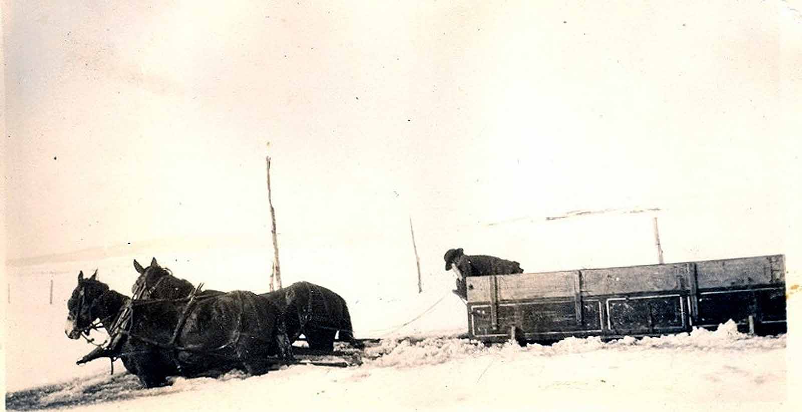 Winter transportation was sleigh and horses. Blankets or quilts were thrown over the hay Dad had placed in the sleigh box with other quilts to keep us warm. What fun it was as we grew older to ride the sleigh runners and hold on to the back of the sleigh box until we got tired.