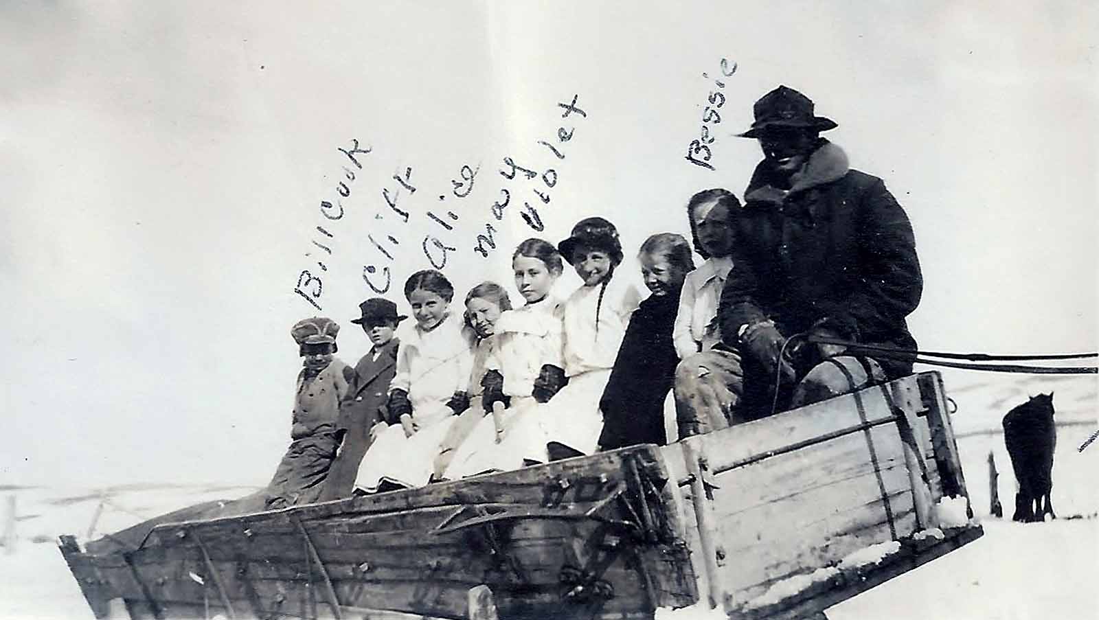 Transportation was a canvas-covered wagon box with boards to sit on on each side. Warm days made it hot inside and no heat was provided so we were cold in winter. Sometimes we'd take a small hot rock to keep our hands warm, played games to clap our hands and stomp our feet to keep the blood flowing. One game we played was "Old Mother Wiggle Waggle is Dead."