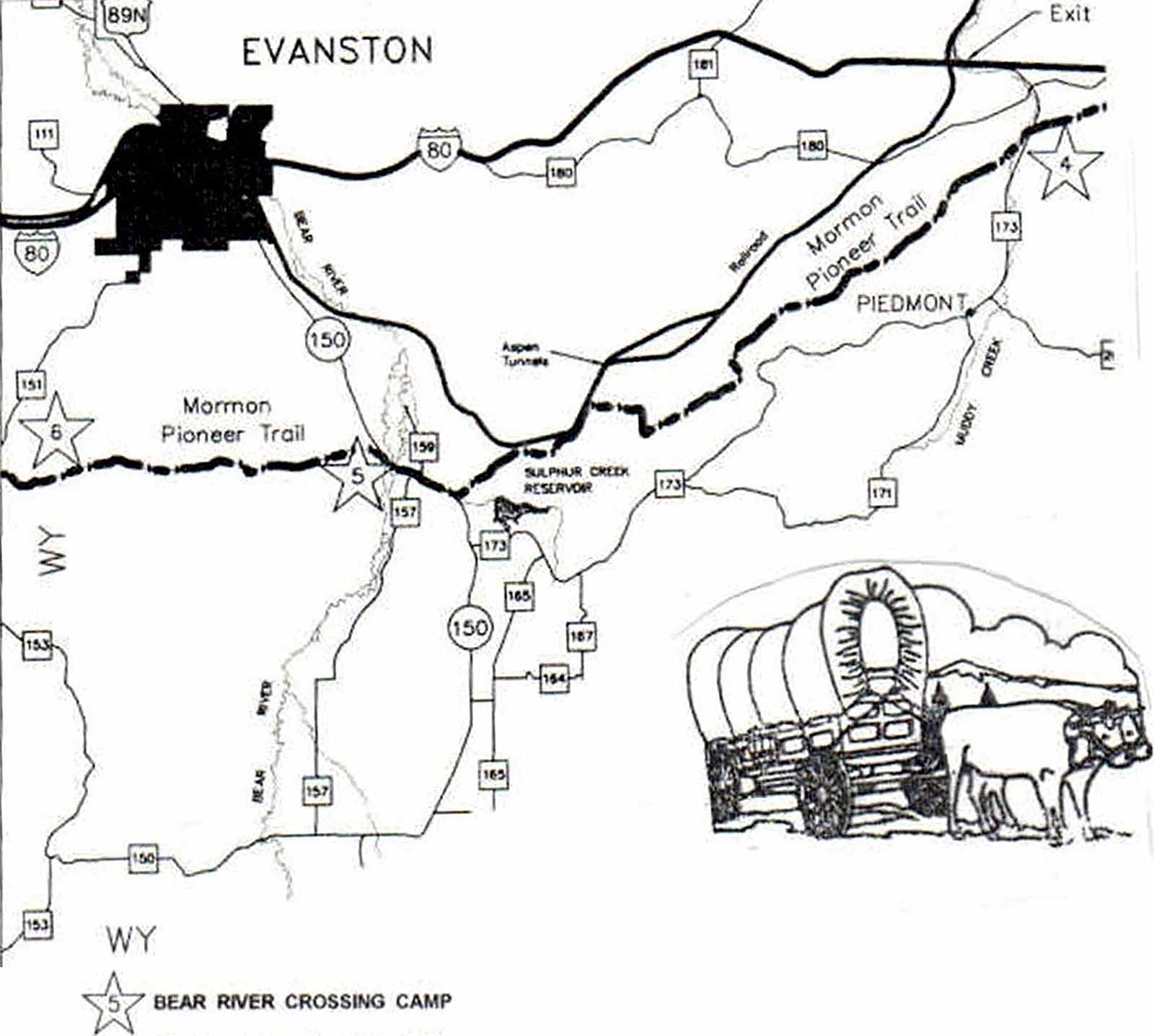 According to history, the first company of pioneers lead by Brigham Young camped here Saturday, July 10 and Sunday July 11, 1847. They were amazed to find a sulfur spring which the cattle would drink, a fresh water spring which was excellent to the taste and a black oily spring which they used to oil their gun stocks, shoes and wagon axles. Those three springs were all located within one mile of each other. This site can be reached by taking I-80 Exit 5 at Evanston and turning onto State Highway 150 South. Follow this highway for approximately 7.5 miles to a bridge over the Bear River.