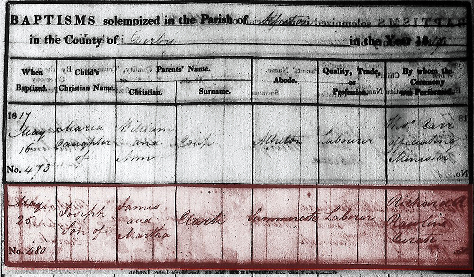 "1817 May 25 Joseph Son of James and Martha Clark Summercotes (Somercotes) Laborer Richard A Rawlins Curate".