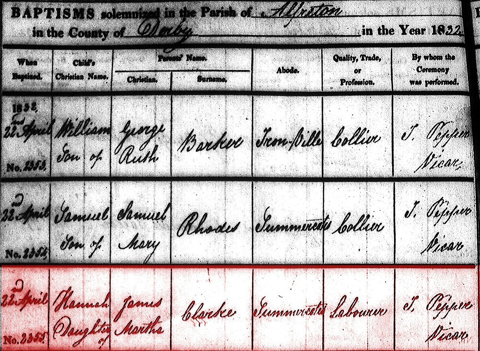 Apparently James and Martha Clark left the Church of England and joined the Independent Chapel of Riddings. Their next child, Samuel, was christened there in 1824.