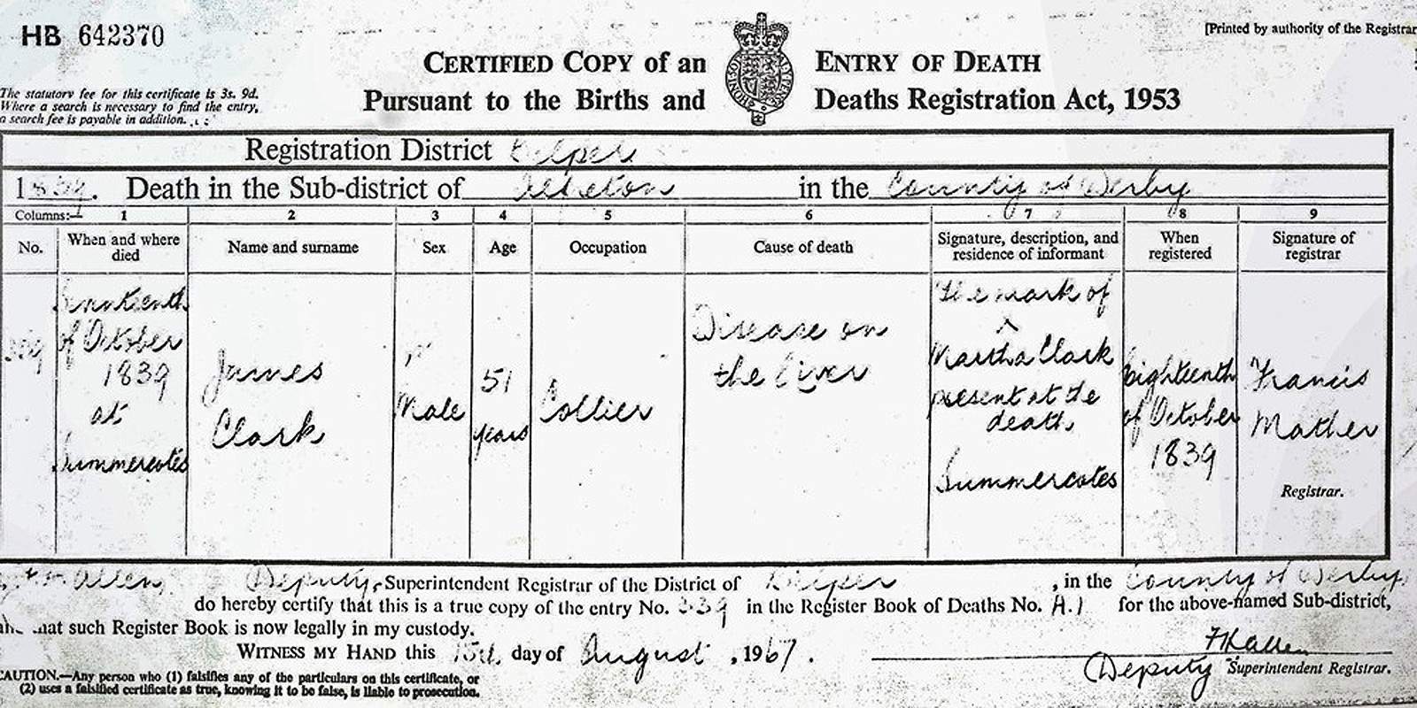 James Clark died in Somercotes, Derbyshire from a "Disease on the liver". The death was registered in the Belper civil registration district on 18 October 1839. The informant was James' wife Martha England Clark who was present when he died. She made a mark for her signature above her name on the death record.