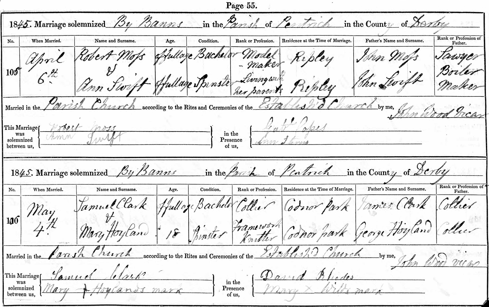 Samuel Clark was married to Mary Hoyland 4 May 1845 in the Pentrich, Derbyshire Parish of the Church of England.