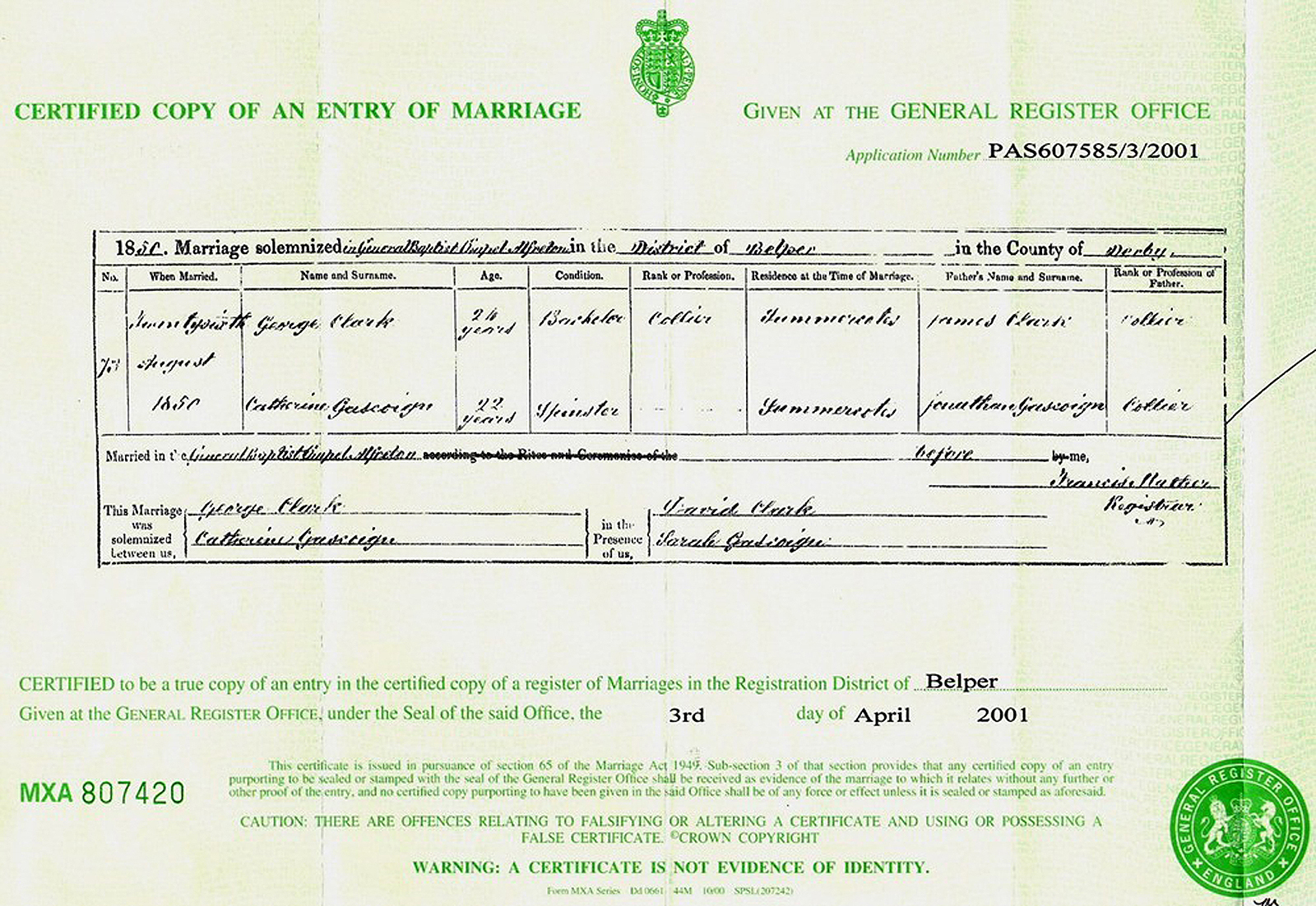 George Clark was married to Catherine Gascoigne 26 August 1850 in The General Baptist Chapel Alfreton, Derbyshire, England.