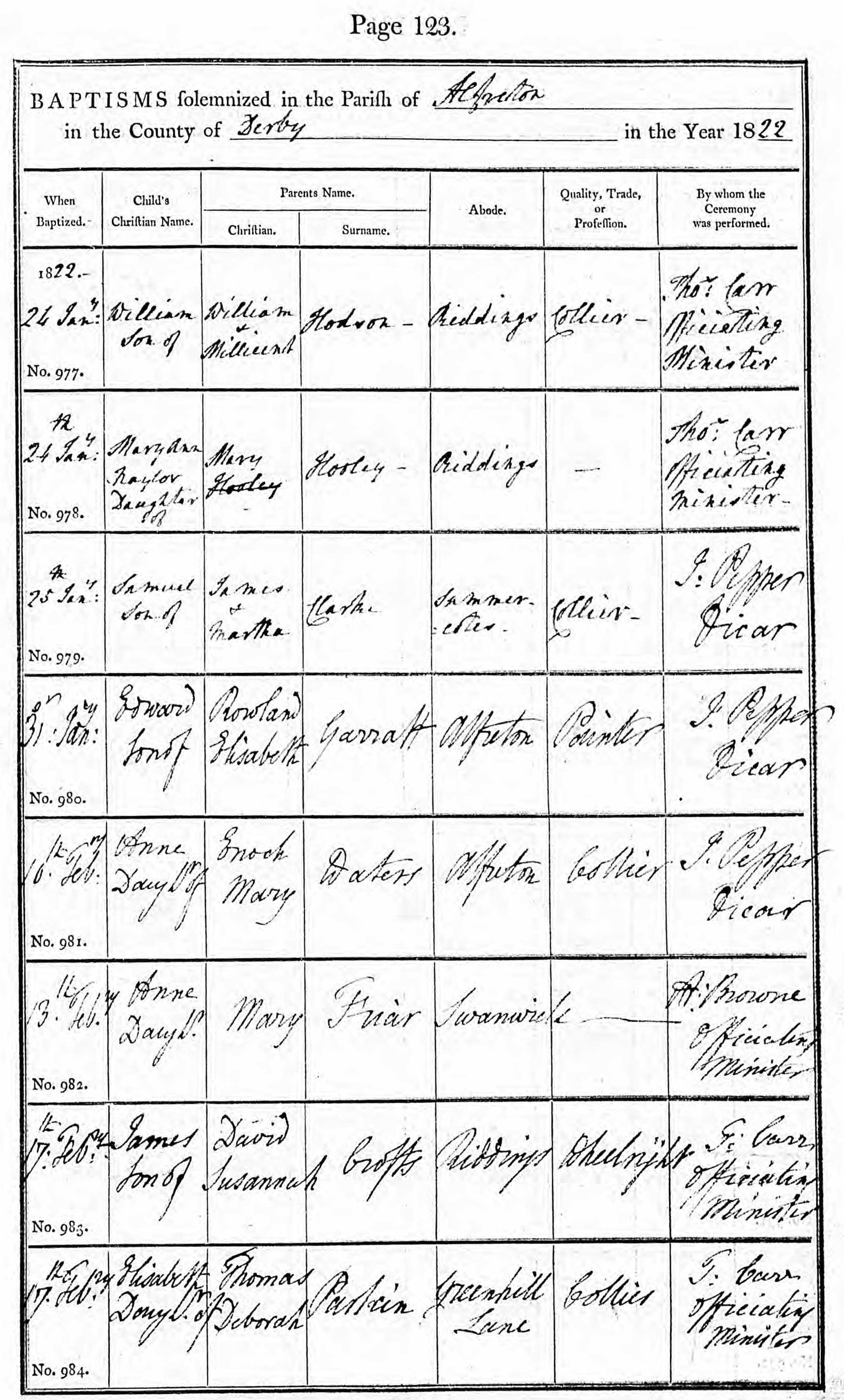 In 1823 the Independent Chapel of Riddings, a non-parochial church, was formed in Riddings, Derbyshire, a small village near Alfreton and Somercotes. The image below shows the certificate or statement to the Crown that registers it as an official religious group.