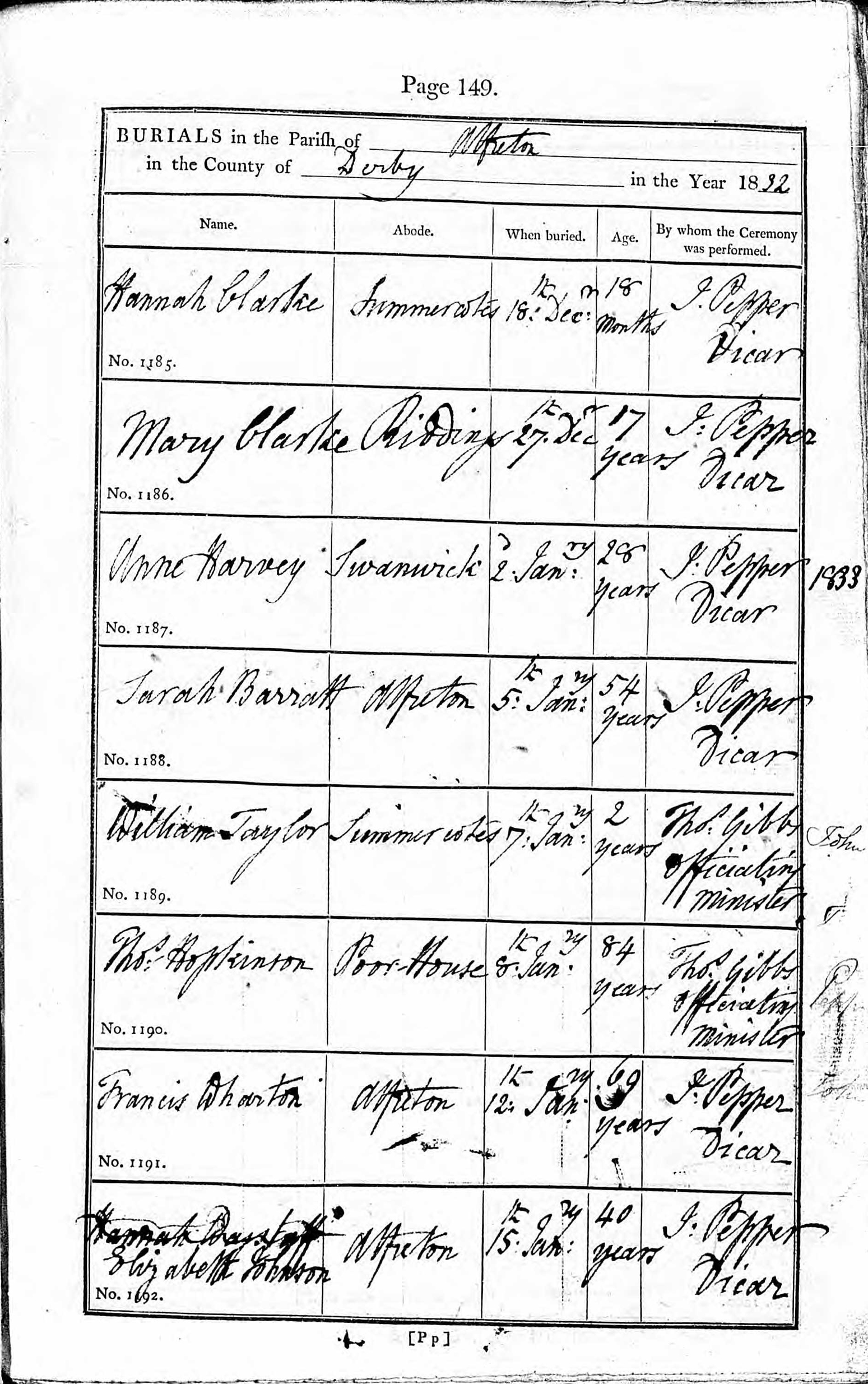 Hannah was buried 18 December 1832, in Alfreton. The burial is the first entry in the image below.