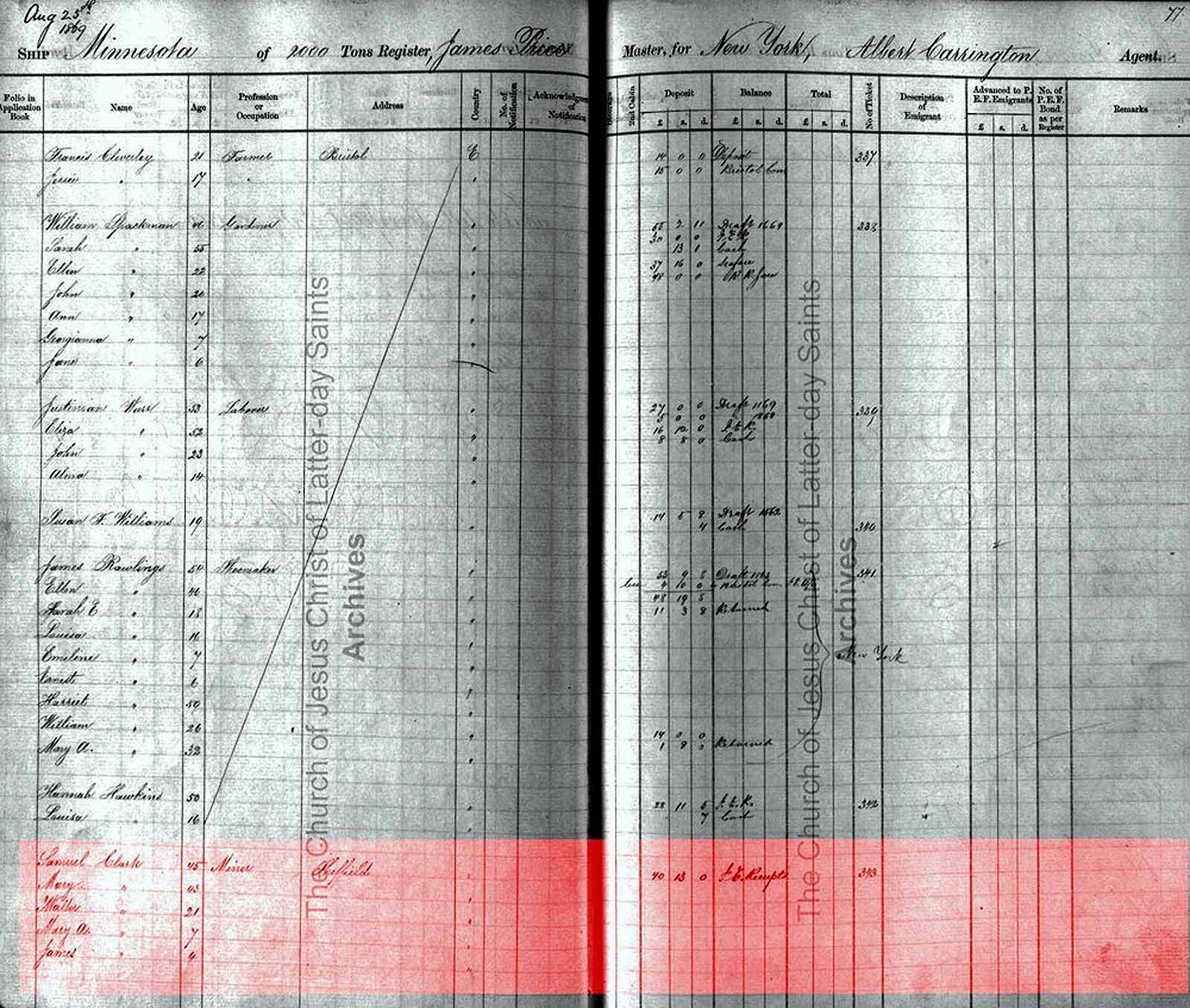 Samuel Clark, with his wife Mary Hoyland and their children Walter, Mary Ann and James left Liverpool on 6 September 1869 on the ship Minnesota and arrived in New York on 25 August 1869.