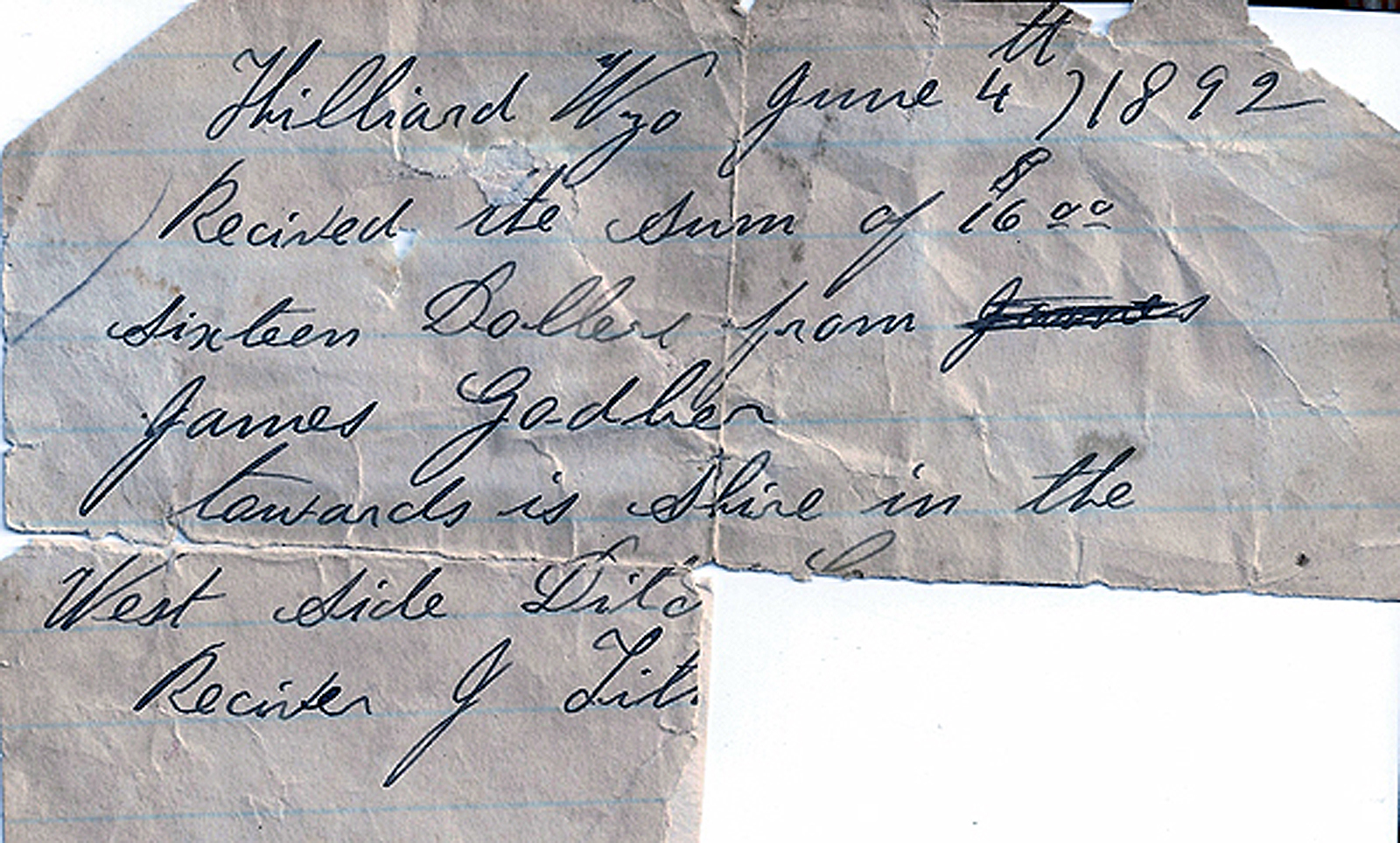 They had been in Almy for but a few years, when they decided to buy some land south of Evanston about twenty miles. The Godbers had come to America to own land, and not to spend their lives working in the coalmines. The exact date of their purchase has not yet been determined, but I have in my possession, a receipt that was dated 4 June 1892, and signed by John Titmus, which acknowledges the fact that James Godber had paid $16.00 for his share in the Hilliard West Ditch Company. Also, we have a copy of the Articles of Agreement and Constitution, as well as the by-laws of the above ditch company, which is dated 20 July 1895. The following are the names of the original stockholders: John Titmus, Sidney Cooper, Ephraim Harris, Matthew Harris, Mrs. Fanny Hutchinson, JohnWagstaff, James Godber, John M. Phipps, Henry Lester, John Bate, Jonathan Hones, William Barker, Mrs. Mary Hutchinson, Mrs. Ellen Clark, Henry Robinson, G.W. Carlton, Snyder and Mills.