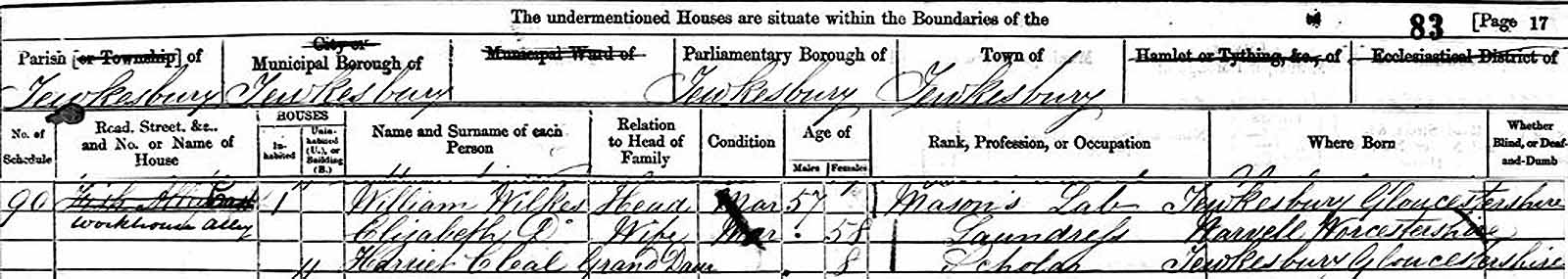 From Chart 3, we see that William Wilkes, a son of William Wilkes and Elizabeth Hunt, now becomes our next descending ancestor. He was born 25 April 1827 in Tewkesbury, and was subsequently christened on 6th of April 1828, when he was nearly one year of age. With his father being a stone or brick mason, we can suspect he may have been required to assist his family by also working in this trade. This seems all the more probable when we note that he is the family's oldest son.