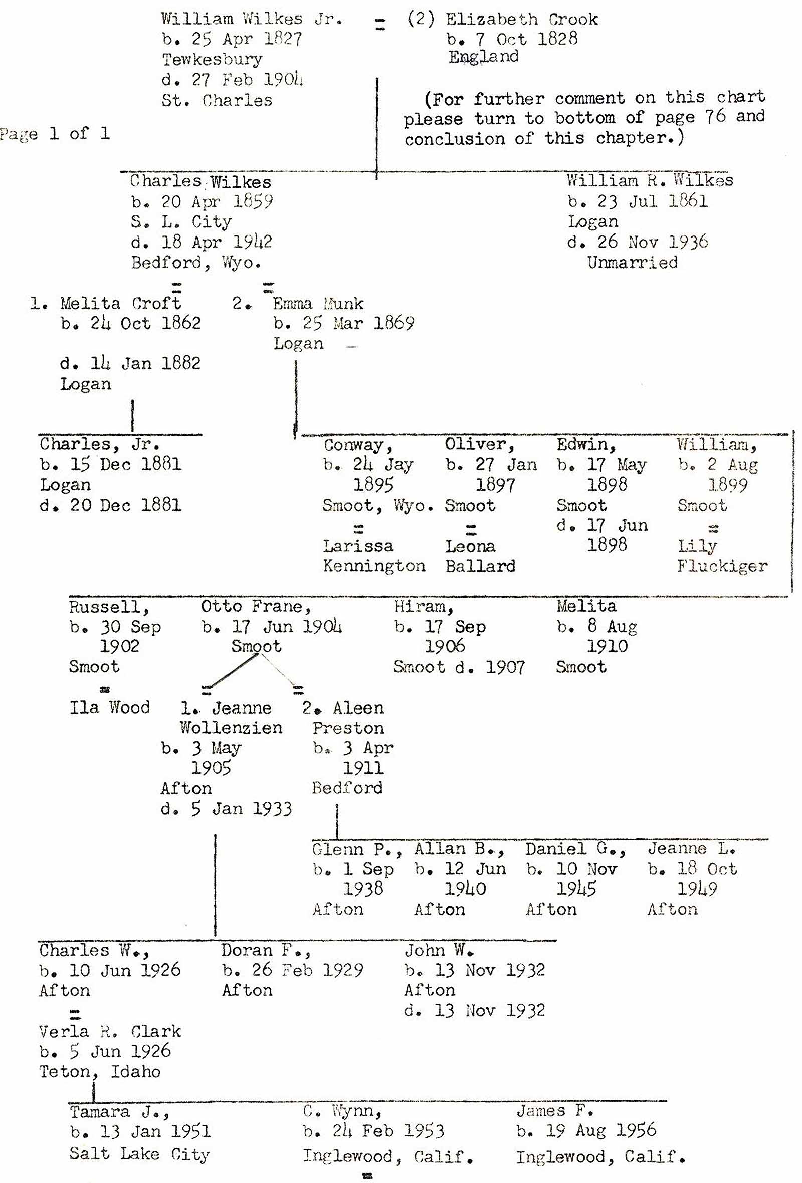 It may be here mentioned that no attempt has been made to extend the family charts of the other branches of the William Wilkes' families, other than of his son, John's descendants, other than the ones shown which information had been gathered through the years. The project would have become overwhelming had an attempt been made to bring the charts completely up to date.