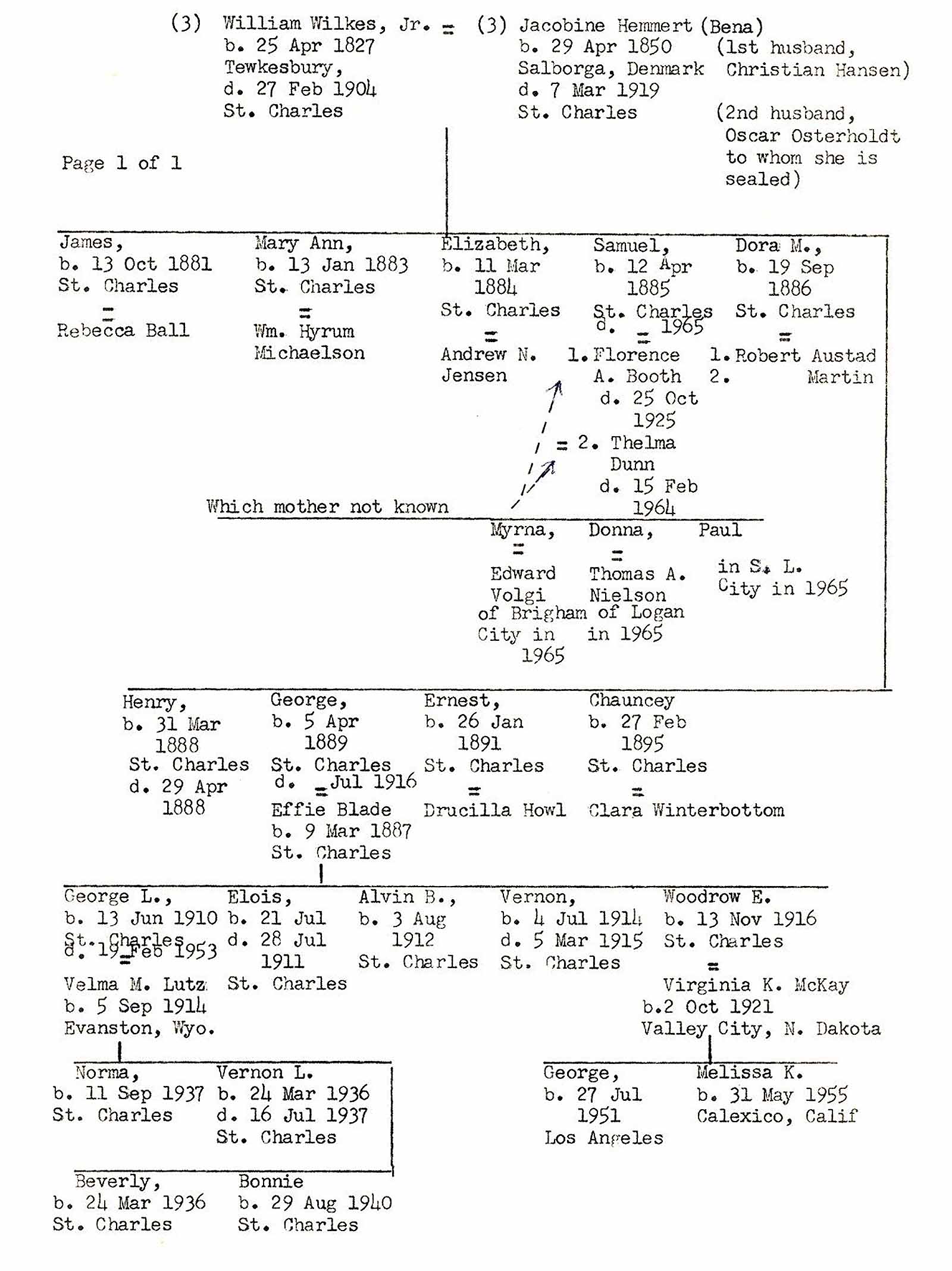 Returning to father, William. He was, indeed, a remarkable man, which statement can be substantiated by the fact that well within one year of the 1880 census, he had married a widow of St. Charles. Whether she had children by either Christian Hansen or Oscar Osterholdt, former husbands, our records do not show. Her record shows she was "sealed" to the latter. The family group sheets handed down from the previous generation shows her only by her maiden name, Jacobine (Bena) Hemmert. The date of marriage of Bena and William is not known, however, their first son, James Wilkes, was born October 13, 1881. Their last son, Chauncy, was born February 27, 1895. Between the eldest and youngest, seven additional children were born, all living to maturity excepting little Henry Wilkes, who passed away April 29, 1888, less than one month following his birth.