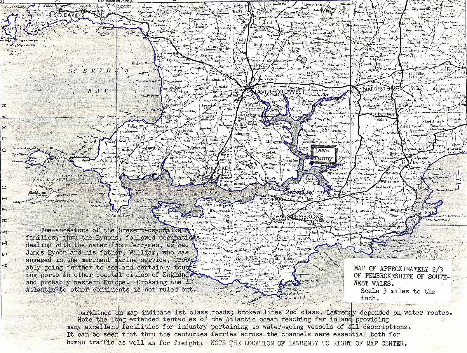 As one views the map of Wales he will discover Pembrokeshire to be in the extreme south and west corner of that little country sticking well out into the Atlantic. The inland portion of the county is agriculturally oriented but our families, living near the intruding waterways of the southwestern corner of the county were engaged in activities pertaining to the sea, such as a dock worker, mariner or ferryman. James of whom we have been writing is identified as being a ferryman, we suspect one who operates or labors on a ferry of which there would be many opportunities. Shipyards were common in the area of Lawrenny which would furnish a great deal of employment.