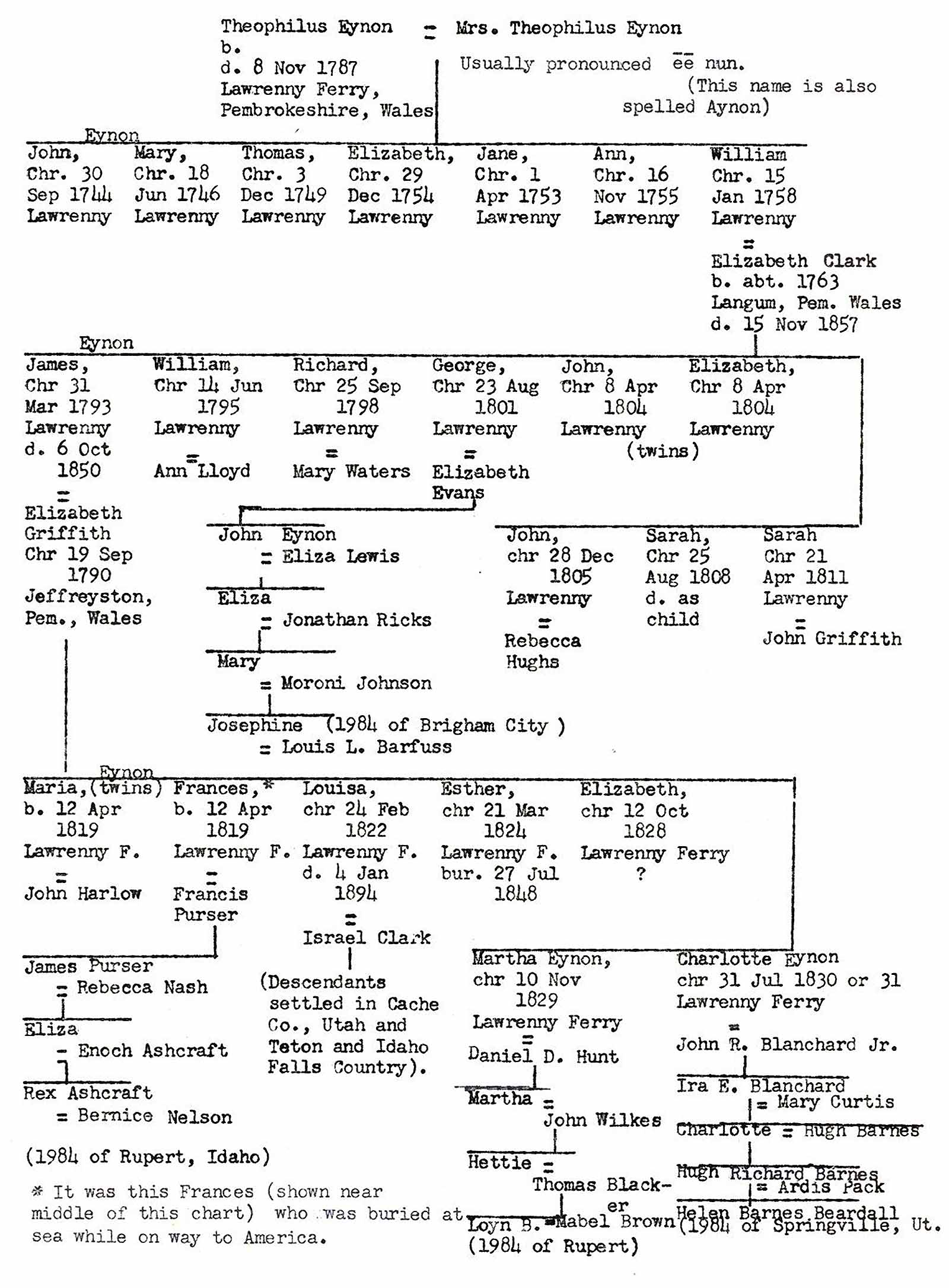 May I suggest that the reader become acquainted with these fine distant relatives if you are in their areas: Helen Beardall of Springville, Utah, a genealogist by her own rights, with whom we have become closely enough acquainted that we speak and write on a first name basis. Six or seven years ago Helen made a special trip to Wales where she visited among the Eynon parishes. It was while on this trip she verified much of the data we have, and extended our Eynon line of ancestry from William Eynon, our James' father, to William's father, Theophilus, our common ancestor. I had the privilege, in turn, to be just a little helpful in a problem she had encountered when, this year of 1984, while I was searching for a possible marriage date in Pottawatomie County, Iowa of our Martha Eynon and Daniel D. Hunt which I failed to locate, but had the good fortune of running across another interesting entry, "John R. Blanchard of Farmersville, Pottawatomie County, age 19 years and wife, Charlotte Eynon of Farmersville, Pottawatomie County, age 19 years were married this 30th day of June 1850" the very information Helen had been searching for for years, Charlotte, Helen's great grandmother.