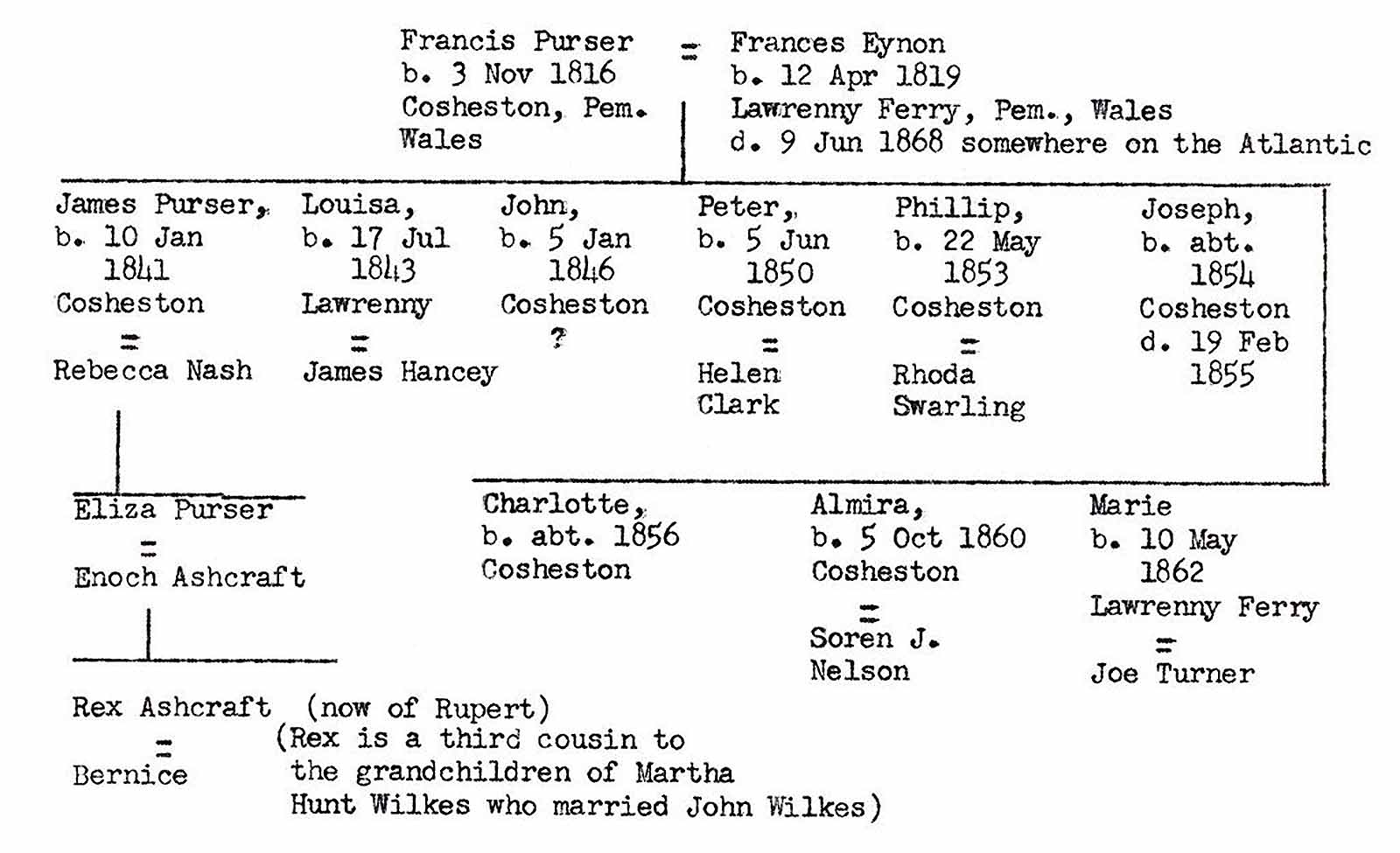 We must not leave our story of James' family of daughters without returning back to Wales where remained daughters Maria, Frances and Elizabeth (of the latter we are not certain). Both Maria and Frances had married prior to the time their father and, at least, three of their younger sisters had migrated. Frances had married a young man by the name of Francis Purser of Cosheston, Pembrokeshire. Cosheston is approximately three miles south and west of Lawrenny, across the finger of the Haven and near to Pembroke Dock. The map does not show Lawrenny Ferry, a suburb of Lawrenny, where our Eynon family actually resided. In all likelihood Lawrenny Ferry was even closer to the water than Lawrenny proper, and so the ferry which spanned the Haven made it not overly inconvenient for a suitor by the name of Francis Purser to make connection with another Frances, this having been spelled with an 'e' rather than an "i". An interesting courtship can easily be imagined by the reader. It will be unnecessary to compare notes after each of our imagined stories.