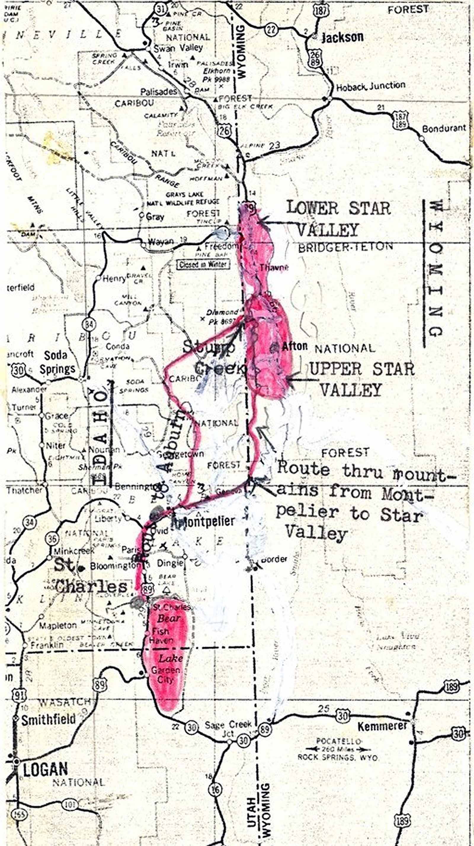 It can very possibly be that before the colony of eight wagons reached Star Valley the travelers wondered why they had selected the Montpelier route for there was another possible route which was considerably longer but not so rugged. After leaving Montpelier it would have been possible for them to have gone north toward Soda Springs, Idaho, and after reaching it's vicinity could have turned eastward and gone down Stump Creek into the power portion of the Upper Valley.