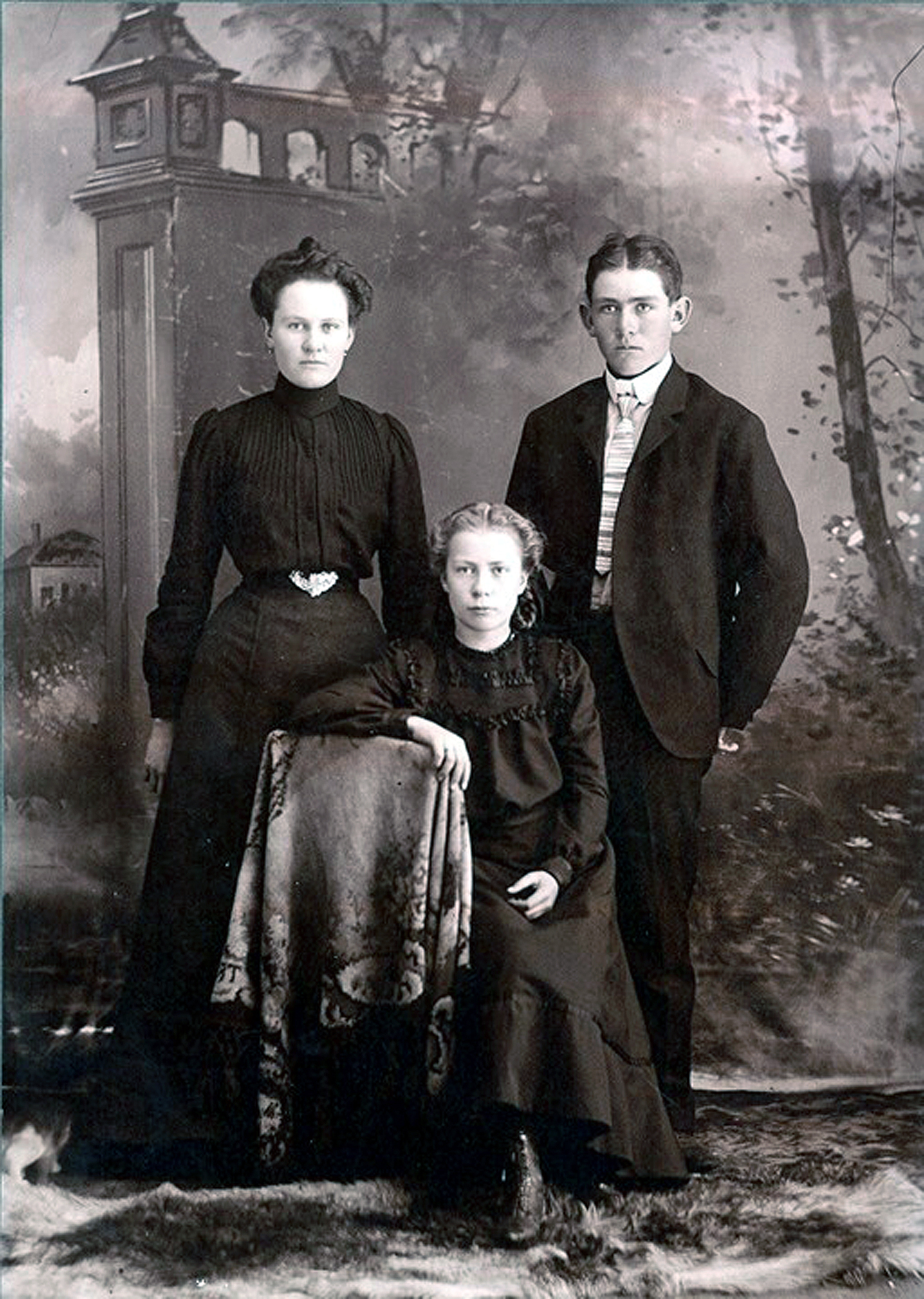 Back: Lottie (Charlotte Ann) Wilkes, Noen (Benoni Gashum Moroni) Wilkes. Front: Leola (Sarah Leola) Wilkes. About 1903