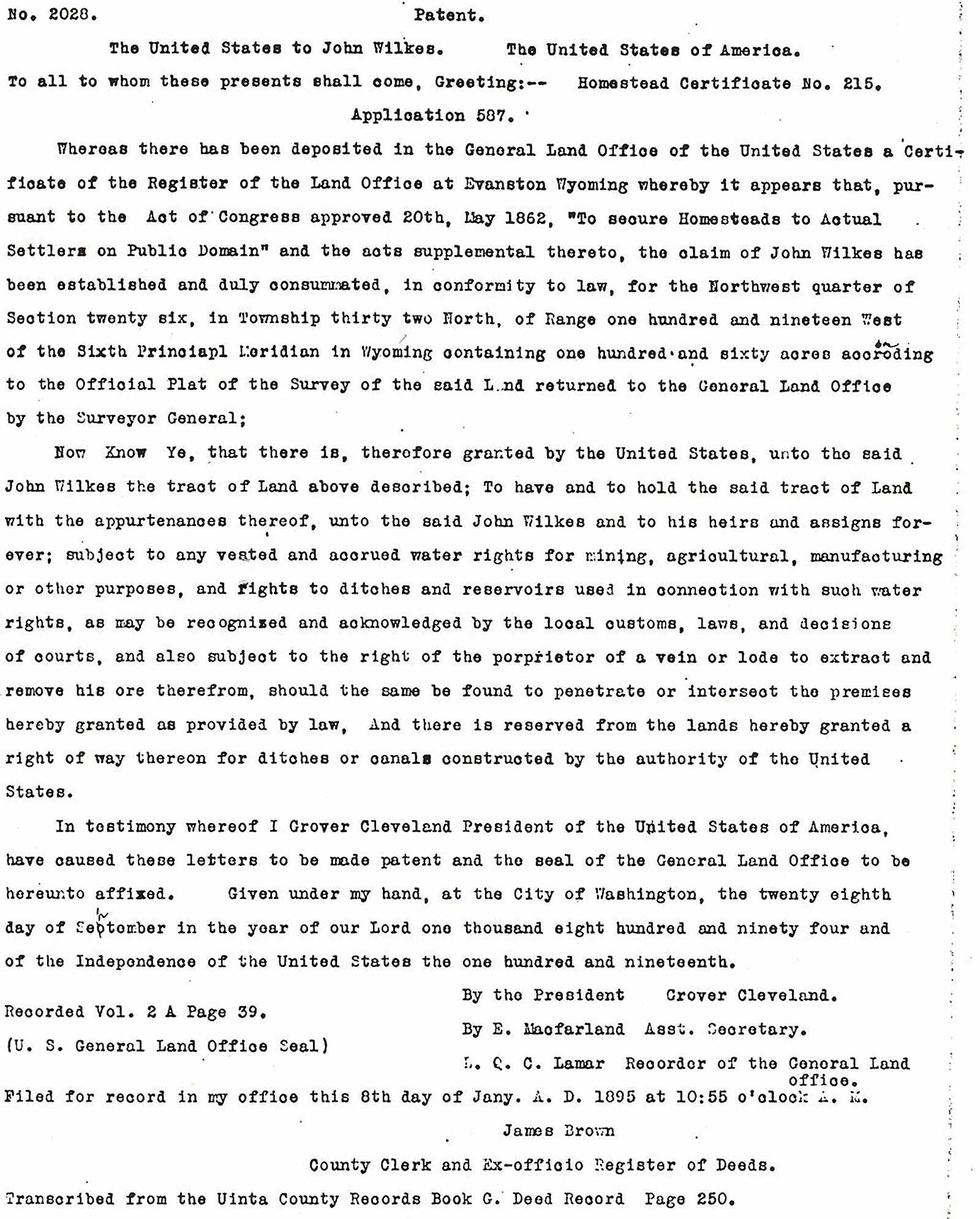 As can be noted, the original patent was dated the 28th day of September 1894 and was filed in the County Clerk's office in Evanston, Wyoming, at 10:55 o'clock the 8th day of January 1895.