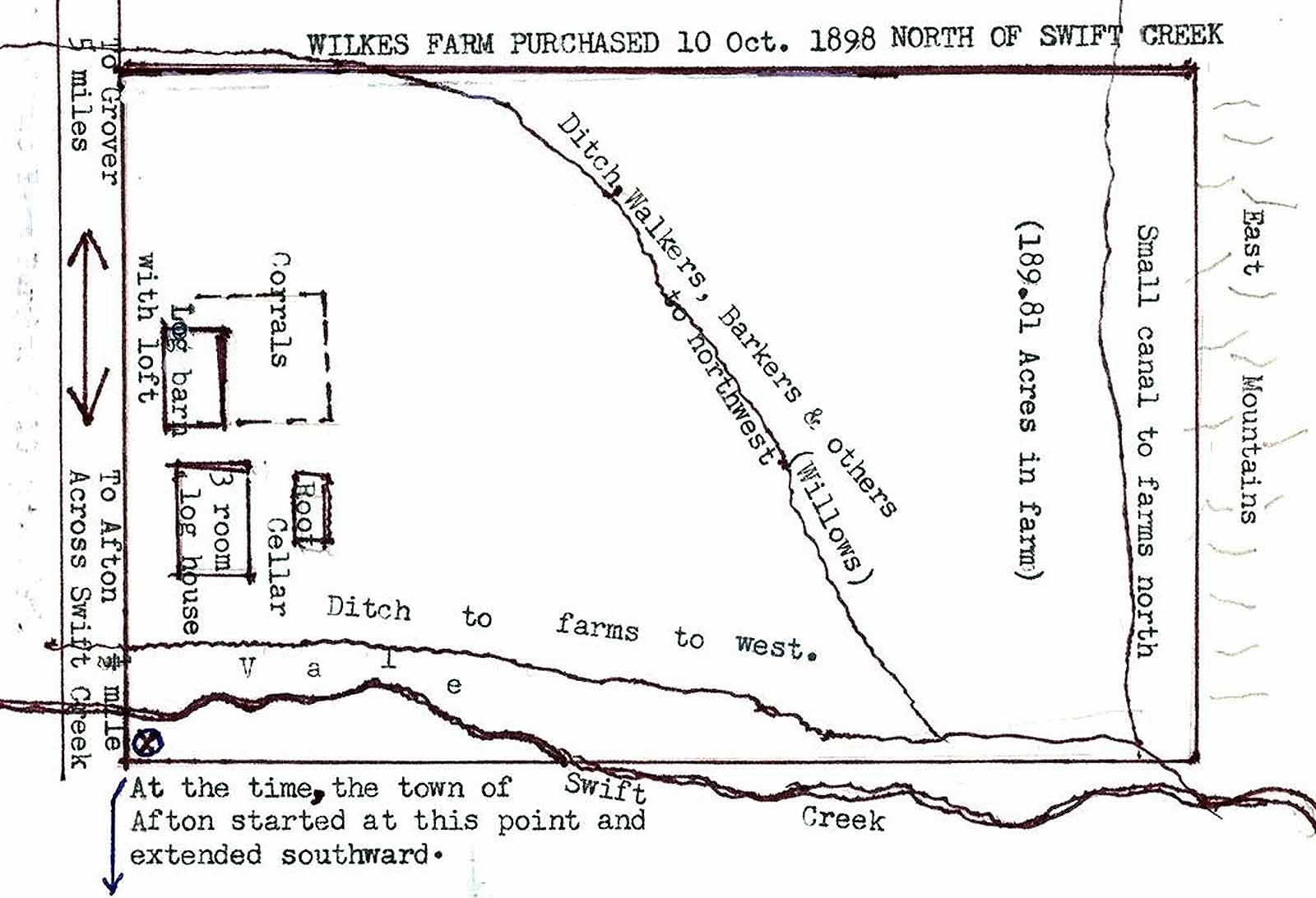 As explained earlier, the Wilkes family moved to their farm west of Afton to a nice home on Main Street. Farming never appealed to Grandpa, probably mostly due to his physical handicaps, but none of us can deny but that homestead on which they moved in about 1887 or 88 proved to be a stepping-stone financially by the mid 1890s when they became able to purchase five acres in town, and also, nearly 190 acres to the north of Swift Creek. It appears they purchased this last farm mainly for investment purposes.