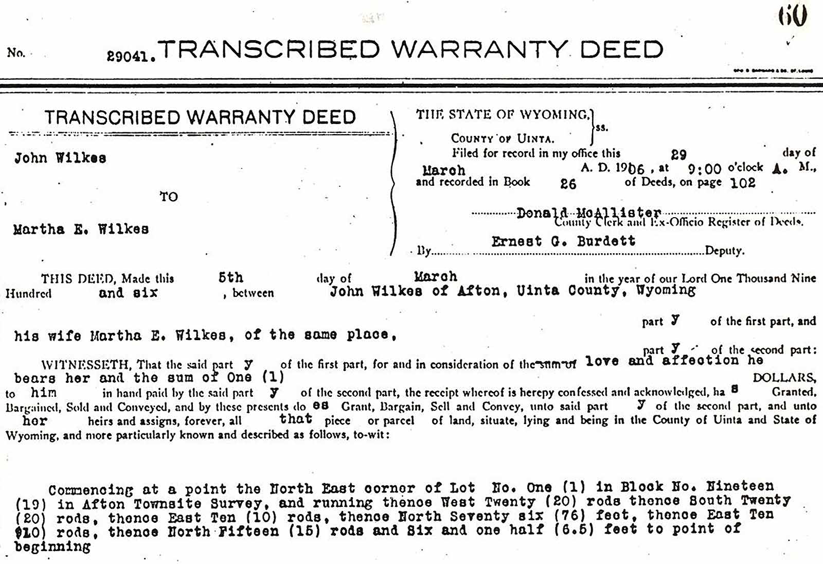 It appears Grandma and the family felt that title to Lot #1 should, at this time, be transferred from the name of John Wilkes to Martha Wilkes. We don't know that it would ever have gotten into other's hands, but wisdom dictated that the transfer be made. It may have been as much a suggestion on the part of Grandpa Wilkes in his sober moments as it was Grandma's or others.