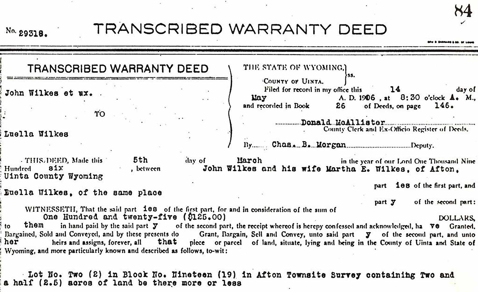 Note the date of the deed - 9th day of September A.D. 1893. It was registered and filed on the 5th day of February 1894, at 5:11 o'clock P.M. Somebody with some influence was in the right place at the right time. Attempting to find the reason, could it have been that the Judge of the Court was aware that John Wilkes, with two brothers-in-law, actually, were the first to settle where the town-site later came into being and spent the winter of 1879-80 in a cabin but, by the time the family returned a few years later, it had been concluded that was where the town of Afton was to be. Is it possible that it was a prearranged trade that was finalized in 1893? Quite possible and the more we ponder, the more likely such could have been.