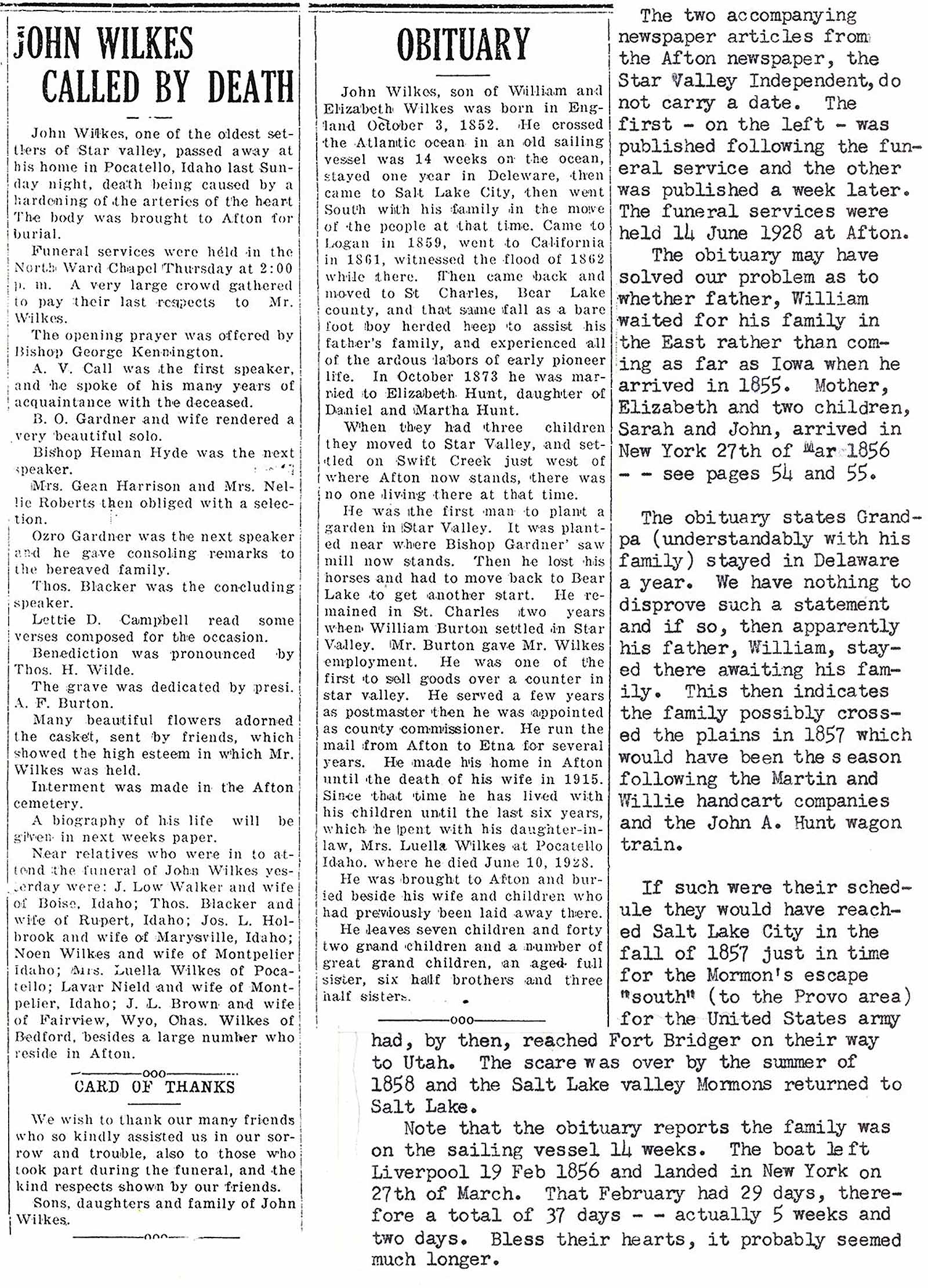 Grandpa Wilkes passed away on the 10th of June 1928 at the age of 76 years and 8 months plus at Pocatello and his body was taken to Afton where he was buried at the side of Grandma Wilkes who had preceded him in death by over 13 years.