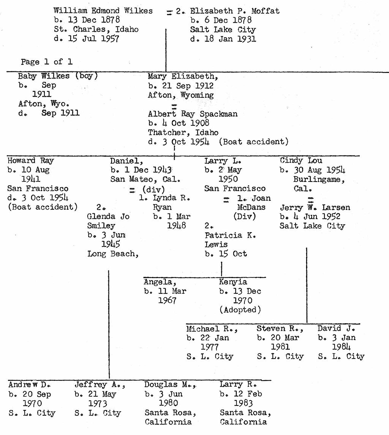 This writer is going to take the liberty for a comment. I recognize, perhaps as much as anyone, that the intent of this family history is to deal with the older generations of the family only with but a page or two dealing with the history of the children of Grandpa and Grandma John and Martha Wilkes and a paragraph or two only of their grandchildren for the purpose only of revealing to all of the younger generations the general direction in life the grandchildren headed.