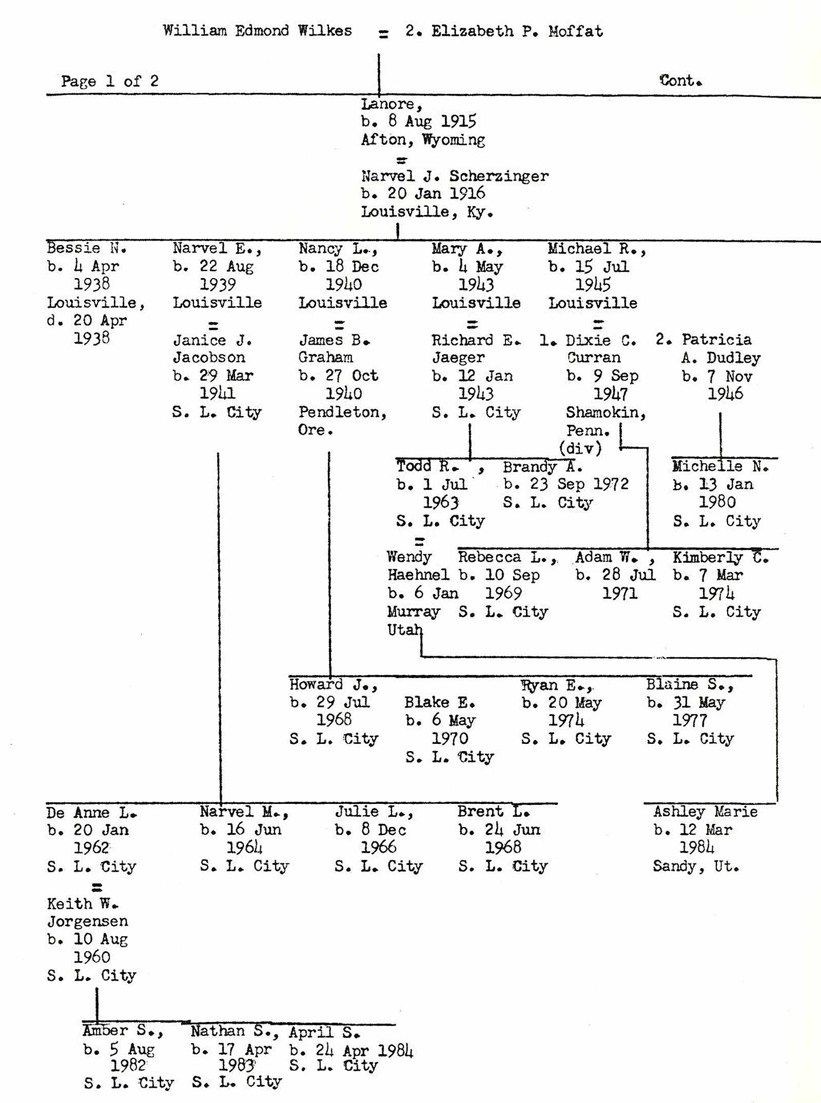 LANORE WILKES: "Lanore married Narvel J. Scherzinger August 20, 1937. She worked as a telephone operator. Narvel was from Louisville, Kentucky and came west with the C C C groups during the Depression of the Thirties. They lived in Louisville for the first ten years of their married life. Narvel was later employed by the C.I. Dearing Publishing Co. He joined the Church in 1943. In 1947 they moved to Salt Lake City where Narvel worked for the Salt Lake Tribune. They had ten children and raised nine of them. The eldest child, a girl, died in infancy.