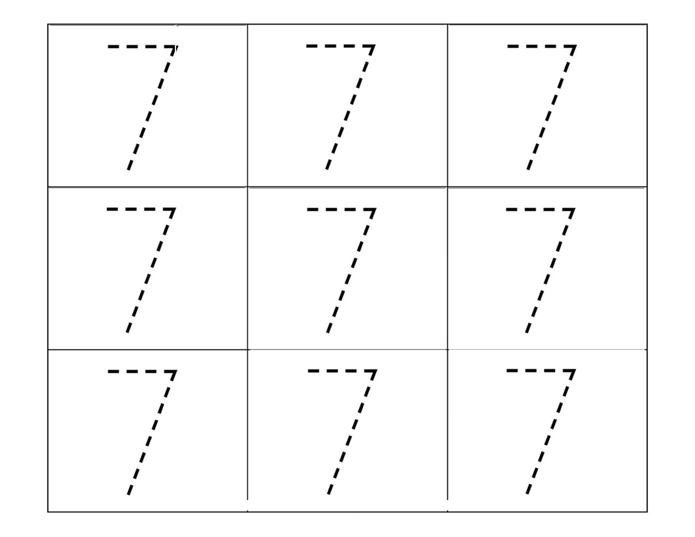 Now we need to make a seven. Sevens are really easy and fun. G-ma will ask someone to draw the dotted sevens for you. As you follow the dots say, "Across the sky, and down from heaven. Seven, seven, seven!" Put seven counters in your counting box. You have been working so hard to count all those counters!