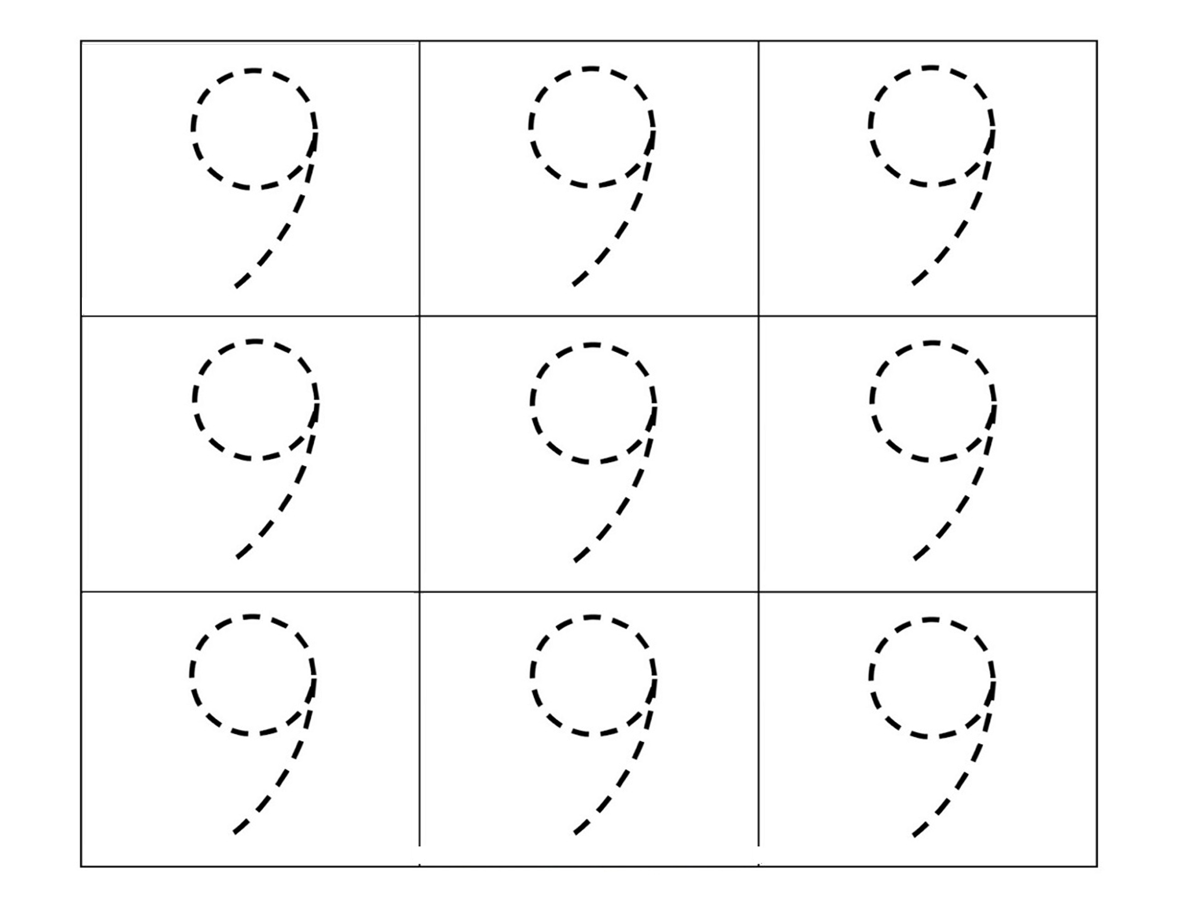 Today is nine day. Make a ball and a line. "Nine, nine, nine!" A nine looks like a balloon on a stick, doesn't it? Make some nines and do your counting box. Just think about how smart you are getting to be because you can put the right numbers of counters in the right places! Always put your counters back in the bag and put everything back in the place where you keep your counting things. You don't want to be messy!