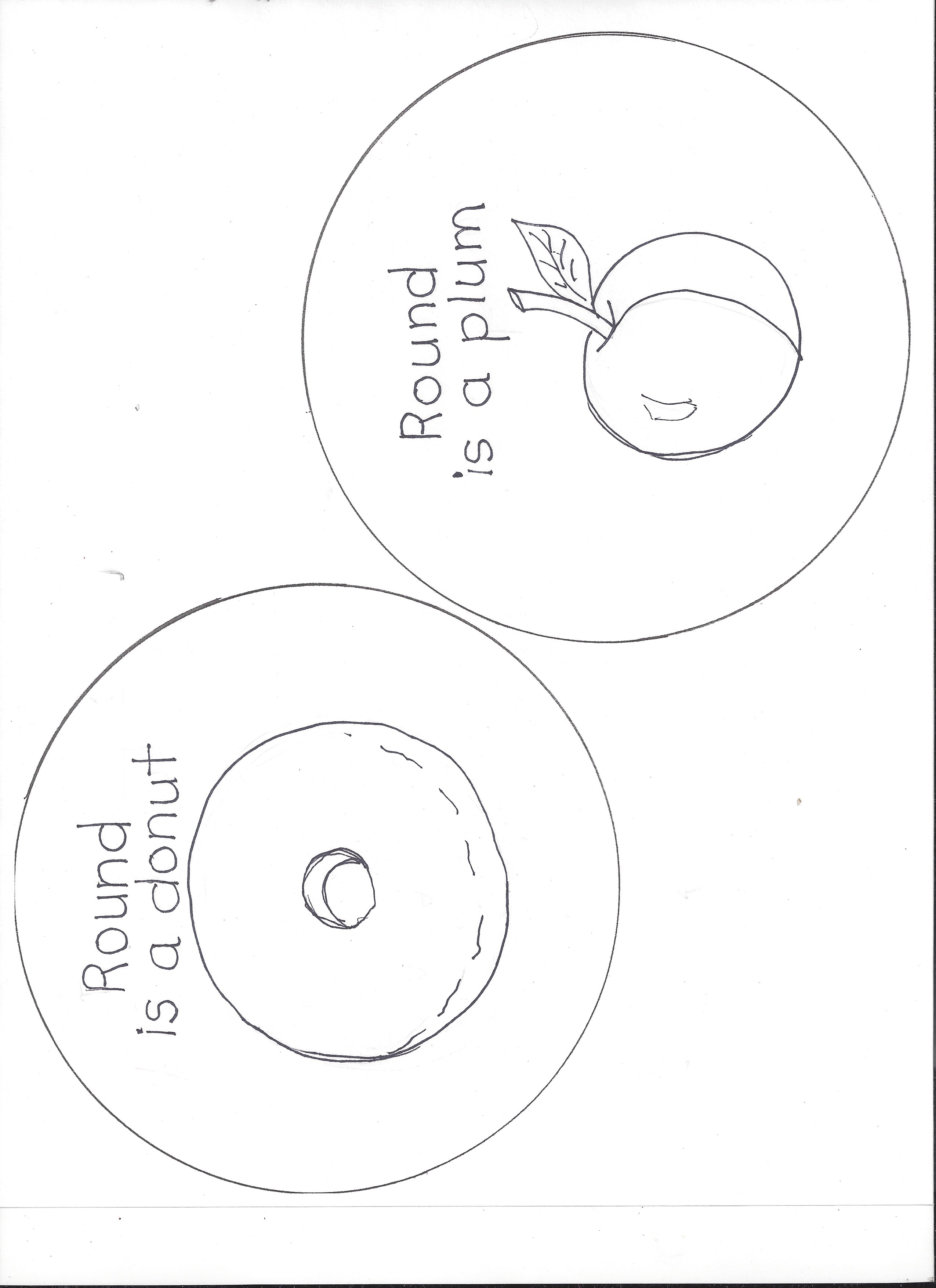Are you ready for the next page of the Round Book? This one will say, "Round is a donut." Donuts have holes in the middle, don't they? Maybe you want to put frosting on your donut and maybe little sprinkles. That will be fun! Also "Round is a plum". Plums are fruits and most of them are purple like the pansy.