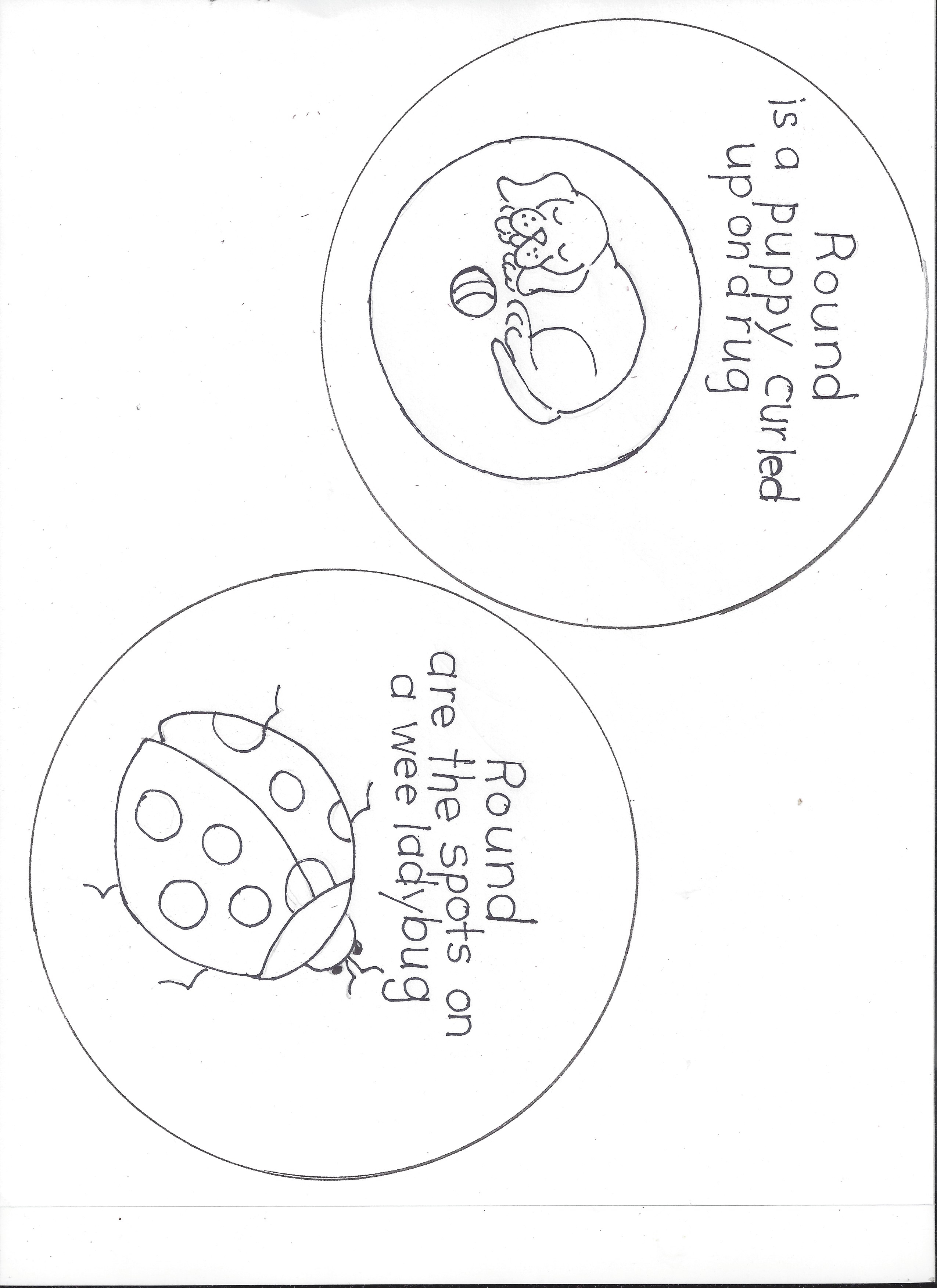 Here are the last two page for our Round Book. One says, "Round is a puppy curled up on a rug." When puppies and kitties go to sleep, they curl up into a round ball. Can you pretend you are a puppy or a kitty sleeping all curled up round? The last page says, "Round are the spots on a wee ladybug." The word wee, means very little. You know that ladybugs are red with black spots. Remember the picture we saw of the ladybug before. Tomorrow we will finish our Round Books by make a front and a back cover. We are so busy! We work and work and work!