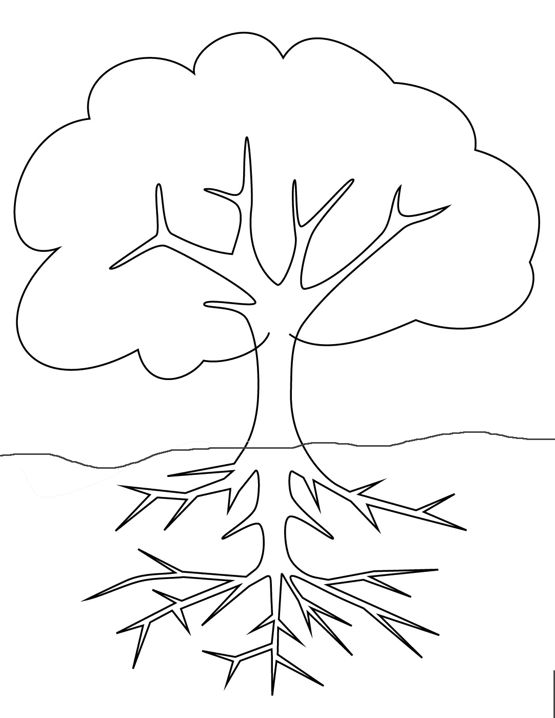A tree has roots under the ground that look like thin branches. Did you know that the roots of a tree grow under the ground almost as big as the branches grow up into the air? Now you can color the ground, and the tree trunk and branches, and the leaves after you print out the tree picture.