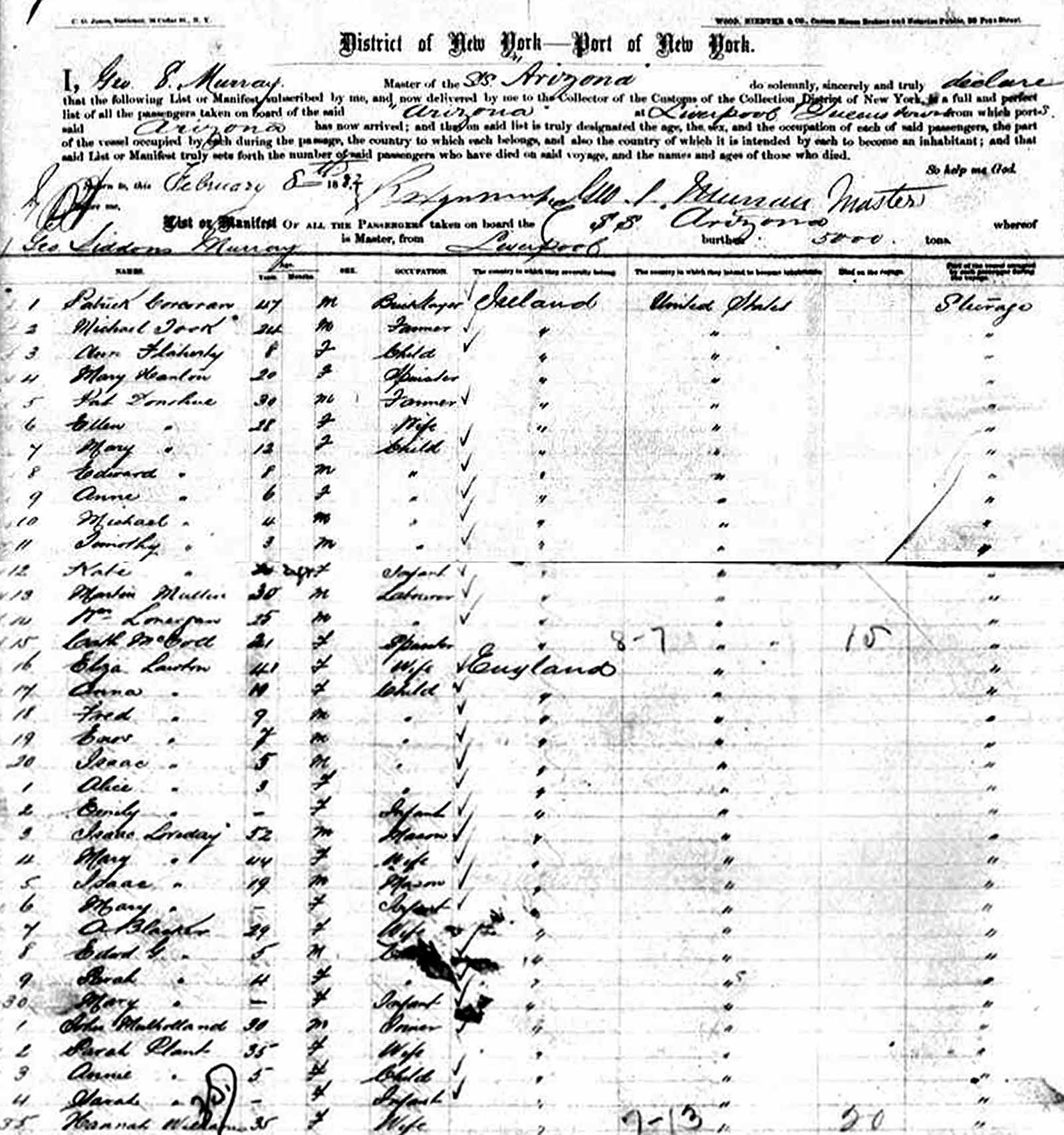 The image below shows a part of the passenger list of journey begun in Liverpool and ending on 8 February, 1882 in New York.