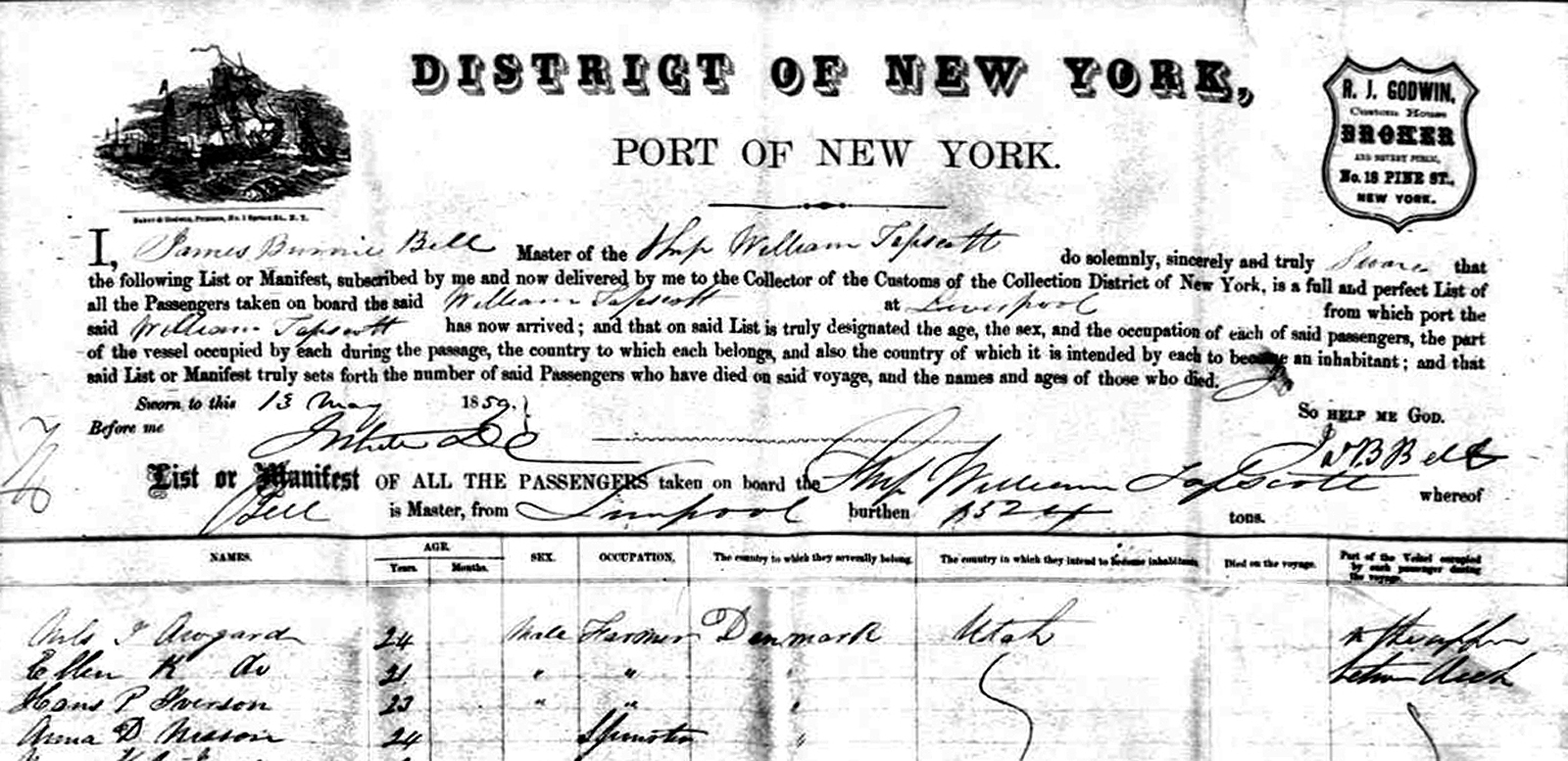 In three voyages the square-rigger William Tapscott transported 2262 Mormon emigrants-the greatest number of any sailing craft. Captain James B. Bell was master during these passages. The first began at Liverpool on 11 April 1859. Under the presidency of Elder Robert F. Neslen and his counselors, Henry H. Harris and George Rowley, the 725 Saints were organized into five English and Swiss wards occupying one side of the ship and five Scandinavian wards the other side. Each ward had a presiding elder responsible for cleanliness and good order. Despite the fact that nine languages were spoken, there were harmonious feelings and unity among the Saints. It was a pleasant and successful voyage. Morning and evening prayers were held, as well as regular religious services. Entertainment consisted of singing, instrumental music, games, and dancing. There was only one death, but two births and nineteen weddings were recorded. After a thirty-three-day passage the emigrants landed at New York on 14 May.